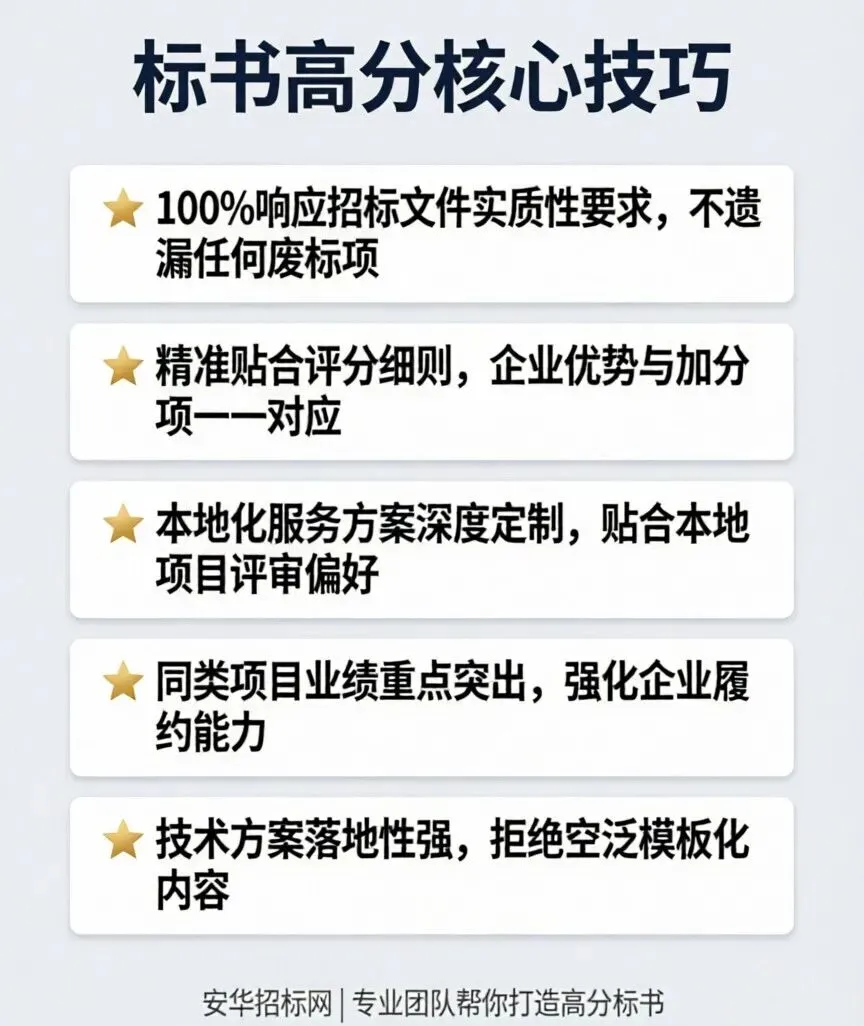 选择标书代写服务,核心不是只看价格,而是要匹配「收费透明 + 专业合规 + 服务保障」的完整服务体系,才能真正规避投标风险,提升投标竞争力。