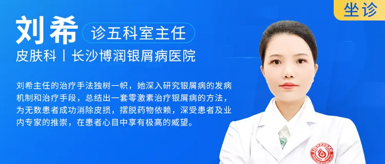 刘希主任是长沙博润银屑病医院副主任医师,拥有近 20 年银屑病临床诊疗经验,深耕各类银屑病诊治,理论扎实、经验丰富。
