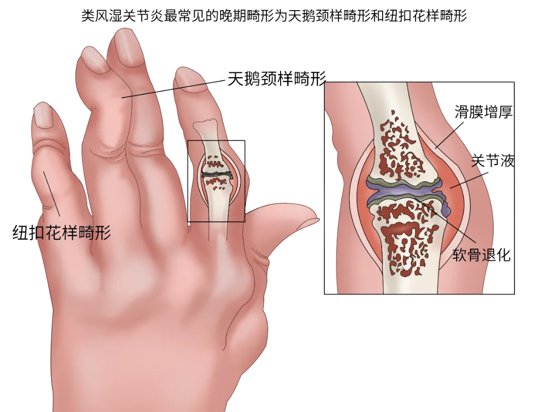 很多人误将类风湿关节炎当成普通关节炎,拖延治疗,导致关节软骨、骨质被破坏,最终出现关节畸形(如手指“天鹅颈”畸形),甚至丧失活动能力。这里要明确:类风湿关节炎无法根治,但早期规范治疗,能控制炎症、缓解症状,阻止关节损伤,不影响正常生活。