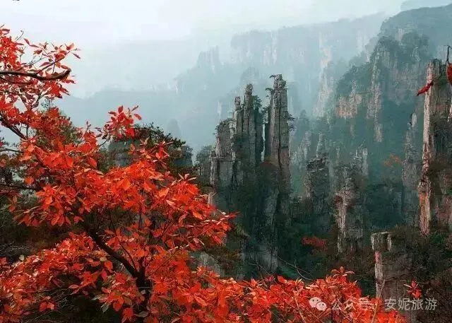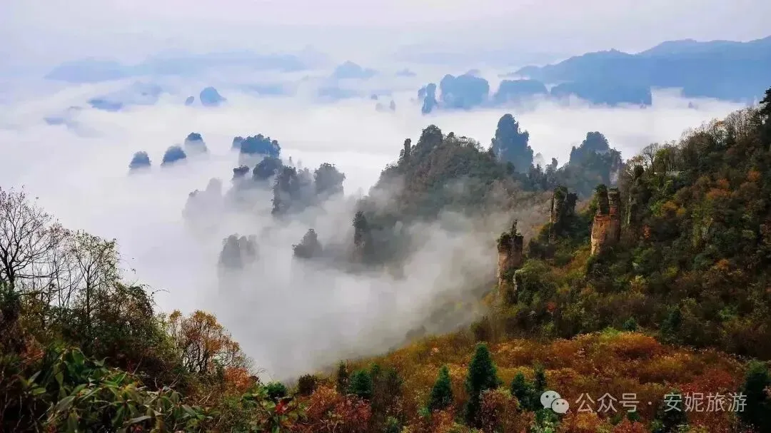 在袁家界可以遠眺“峰林之王”稱號的【天子山】,天子山美景,春、夏、秋、冬西季不同,晨、昏、午、夜四時各異。乍晴乍雨或晨錯交接之時,天子山雲煙繚繞,或鋪天蓋地,或嫋嫋婷婷,靜如薄紗籠罩,動則運天雪湧。