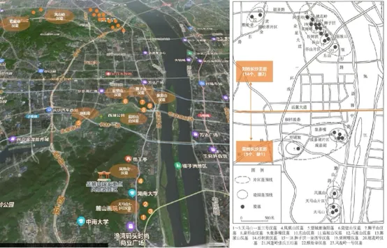 长沙2010年前已经发现7座长沙王室汉墓(某代吴氏长沙王的王后“渔阳”墓、望月公园内及周边的象鼻嘴、狮子山、陡壁山、扇子山4座汉墓,以及风篷岭、风盘岭2座汉墓),近几年又陆续发现了16座西汉时期长沙王王室成员墓葬,这23座汉墓的分布基本上确定了西汉时期长沙王陵区的位置和范围,南北跨度约15公里,东西跨度约2公里(见下图:来自何旭红《汉代长沙国考研发现和研究》)。西汉长沙王传世13代,除了刘氏最后1位王被废不能入葬王陵区外,其余12位长沙王及其王室成员绝大部分葬在了湘江西岸的低矮丘陵地带。