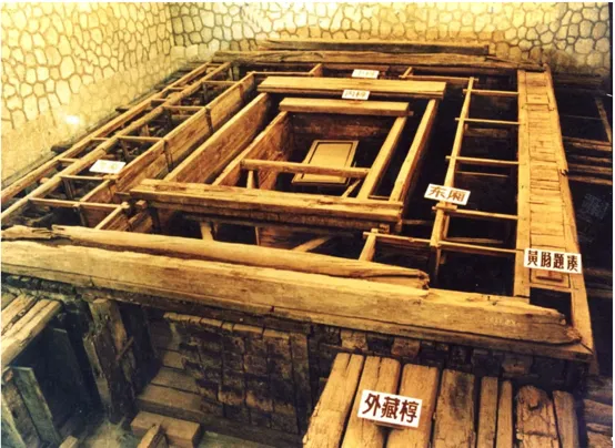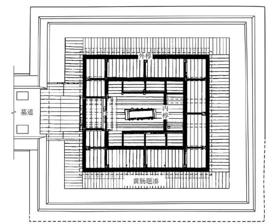 黄肠题凑位于坑壁与外椁之间,紧贴外椁及通道墙板四周,与墓室壁间空隙填充夯打的黄砂土和砾石等。题凑以内的外椁、内椁、棺室形成两处回廊。外椁西墙正中开设双扇门,连接通道与前室。前室四面皆通,西接通道,东连内椁室,南北分别通向内、外椁之间的回廊,该回廊由立柱、隔板、门扉、横梁等将其隔互通且独立十二间小房间。由前室经内椁门通往内椁室,内椁墙板与棺室墙板间的空间为另一处回廊,除开设内椁门的西边外,其余三边被分隔为五处小空间。