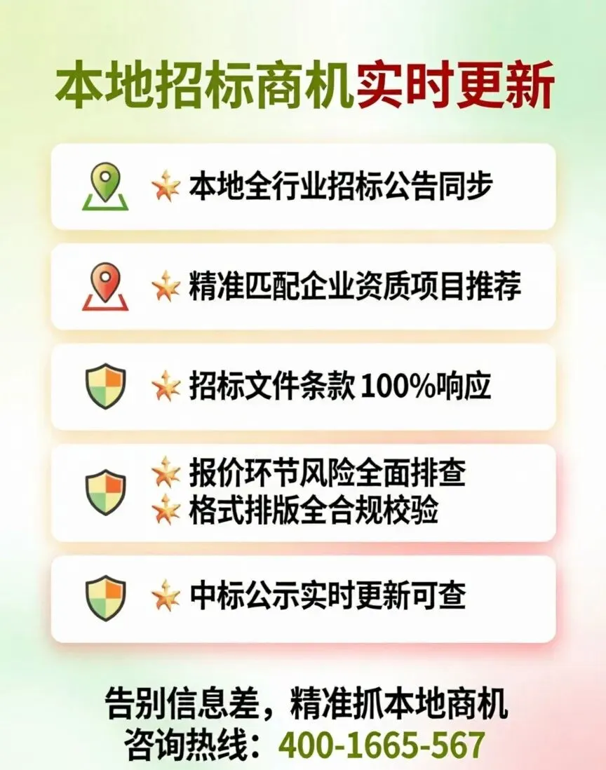 我们为本地投标企业准备了专属福利,现在即可免费领取:✅ 长沙市政工程标书编制高分技巧与模板电子版✅ 安华招标网(www.ahzb.net)本地 7 天免费会员权限✅ 本周最新精准高潜力市政工程招标商机清单✅ 本周内前 20 名预约,免费 1 对 1 市政工程标书合规诊断服务
