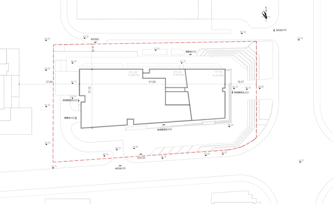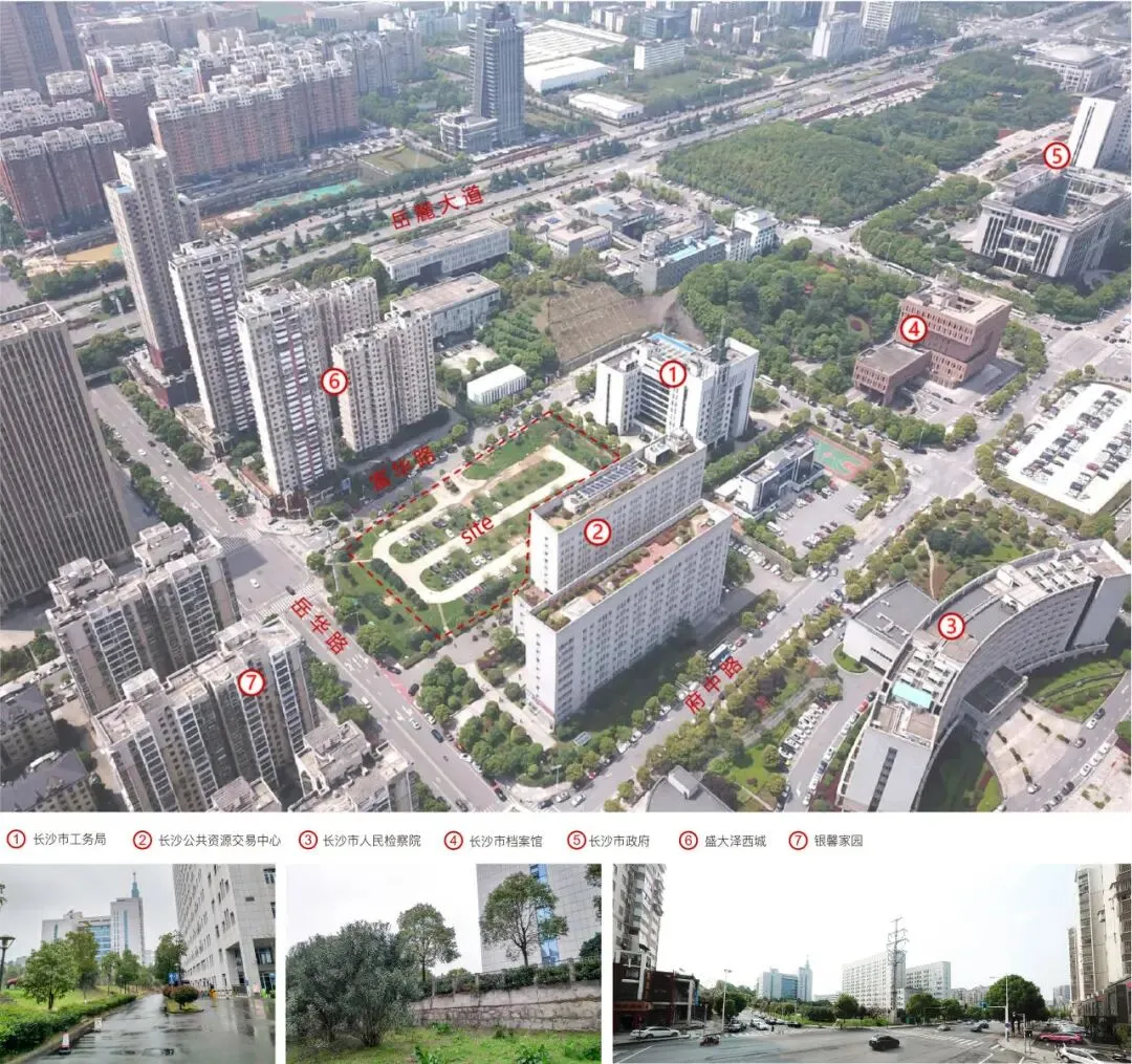 项目坐落于岳麓大道以北、岳华路以西,紧邻长沙市政府,是城市核心发展轴的关键节点。场地呈狭长形态,东西向存在5米自然高差,周边建筑平铺而密集,场地在80米高度可远眺湘江。