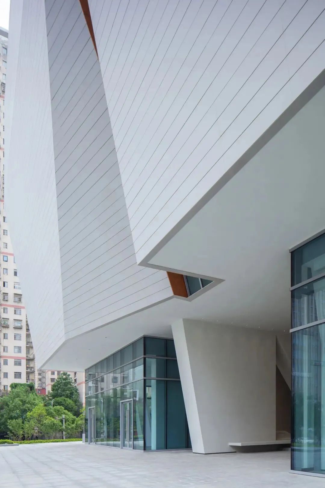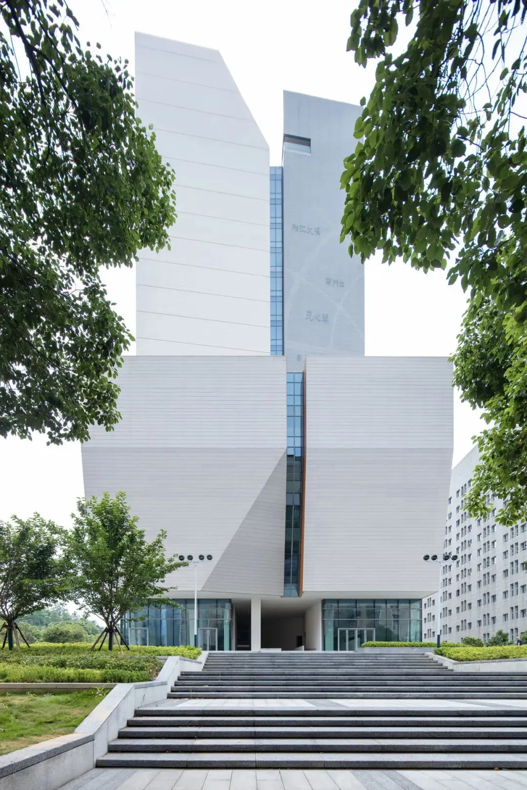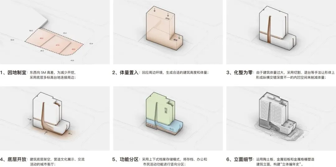 项目突破传统档案馆的封闭保管模式,向图书馆、博物馆功能延伸,实现公共资源集约化与开放式管理,推动档案资源从“封闭库房”向“公共共享空间”转型。针对长沙湿热气候及狭小地块的局限,项目将档案库房“悬浮”于塔楼部分,形成垂直上下分区,管理安全方便的同时留出下部开放空间,构建功能与技术深度融合的有机整体。