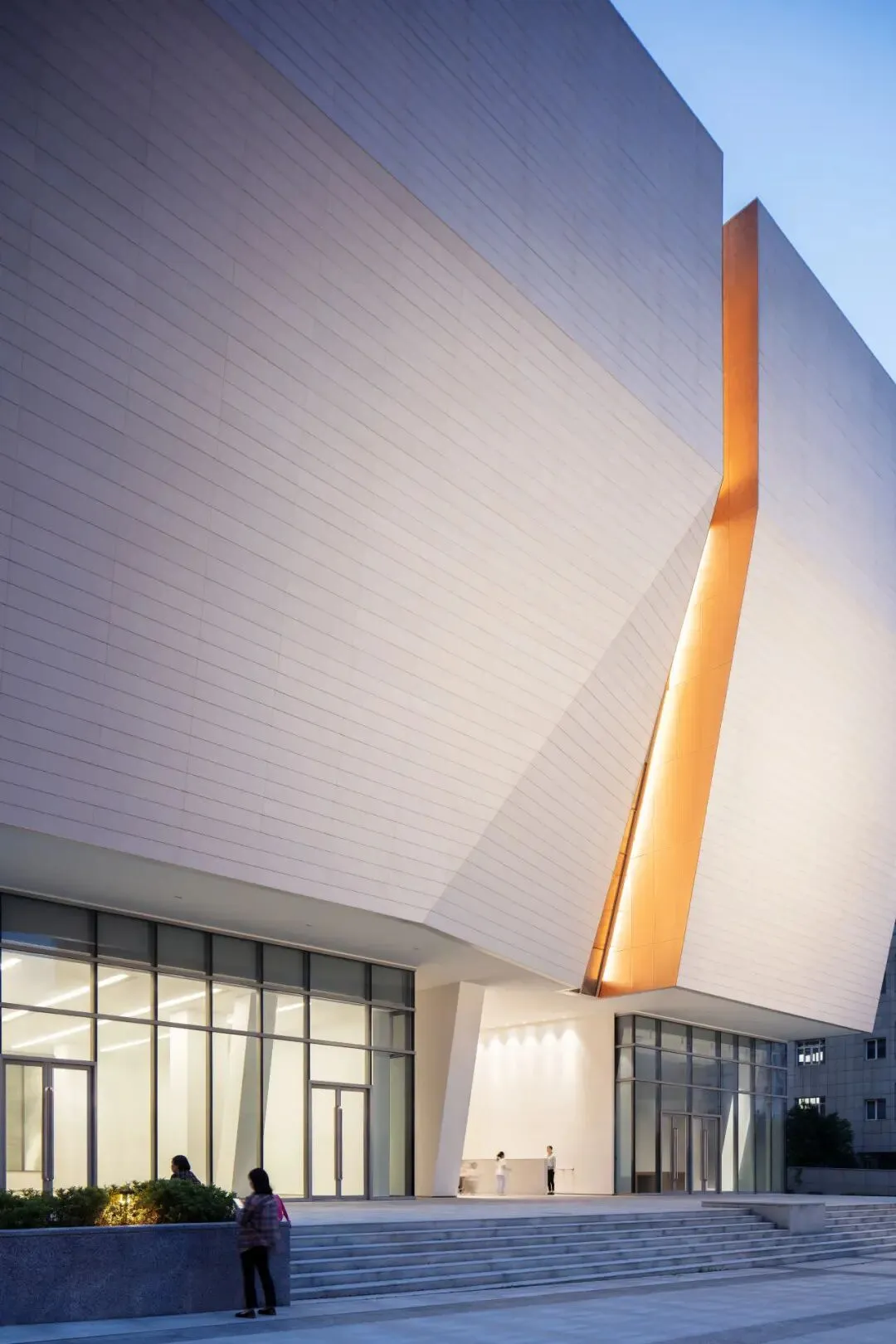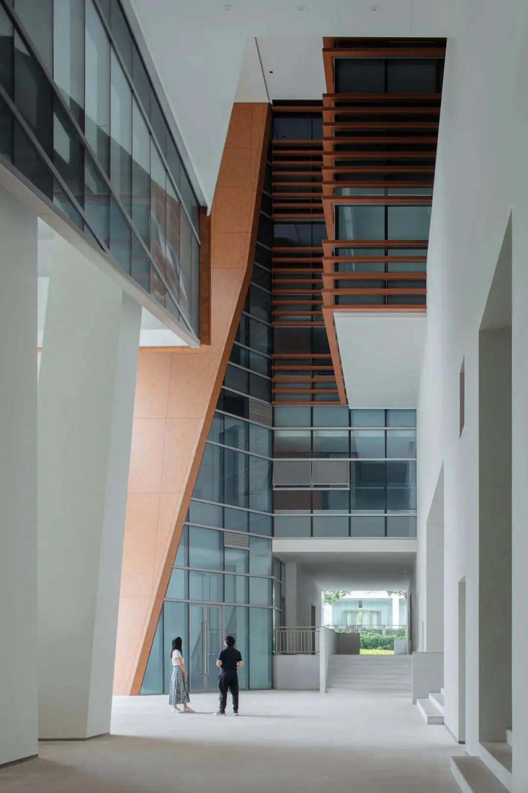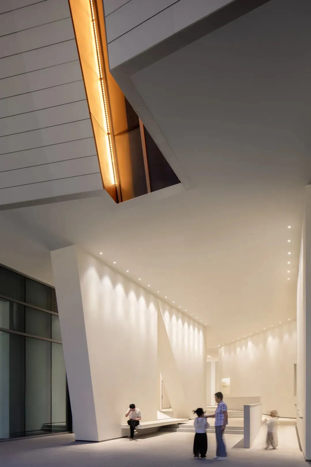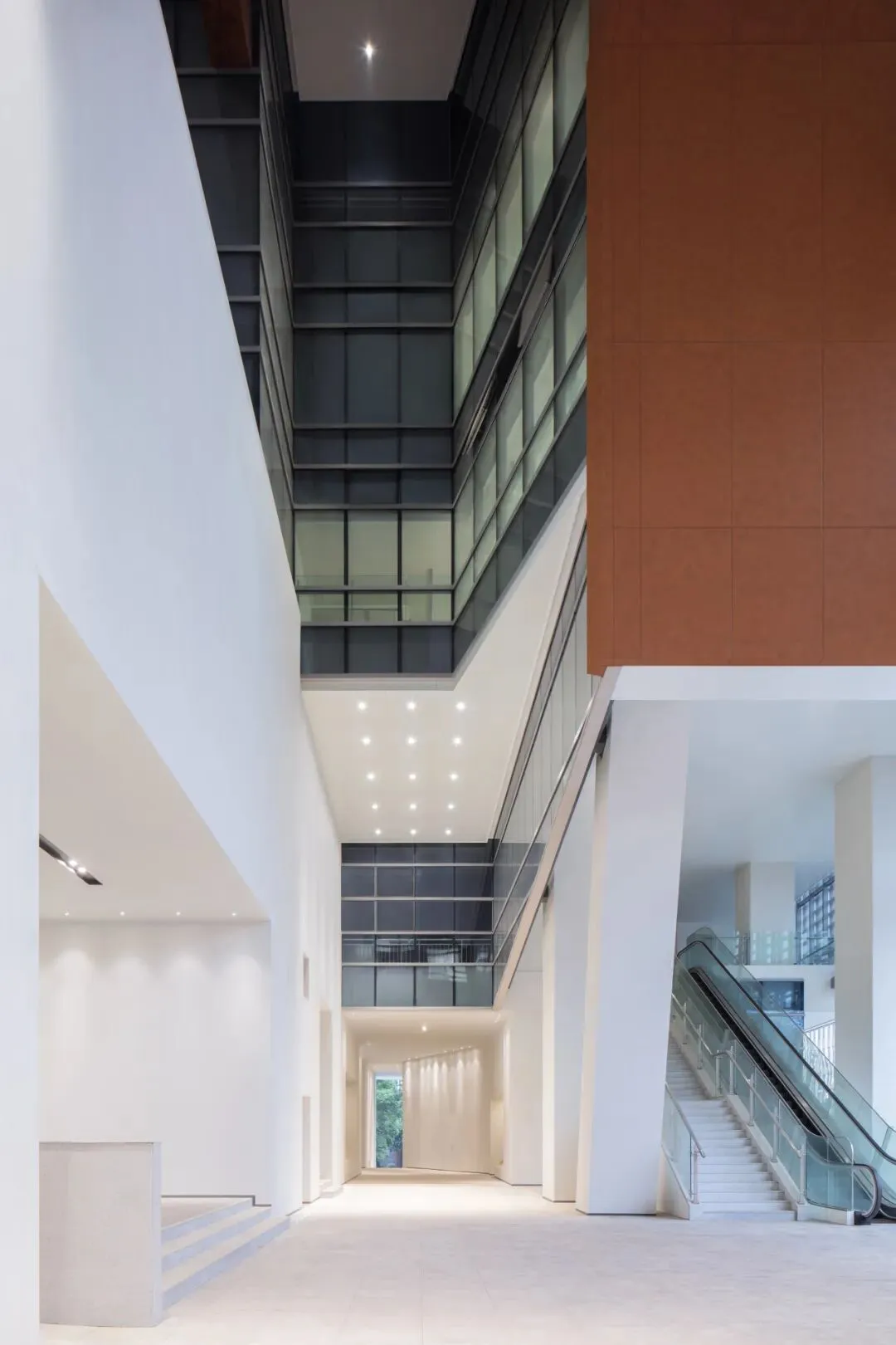 建筑为消解体量,形成东西南北四条凹槽,南部的主入口处上下贯通,斜切开洞,更是如历史长河般倾泻而下。中间结合二、三层展陈查阅空间的错落分布,形成多条错动的走廊,将东西两个建筑体块自然连接,满足市民查阅档案、参观展览、休闲交流等多元需求,也仿佛城市裂痕的有机织补,给人强烈的视觉冲击。