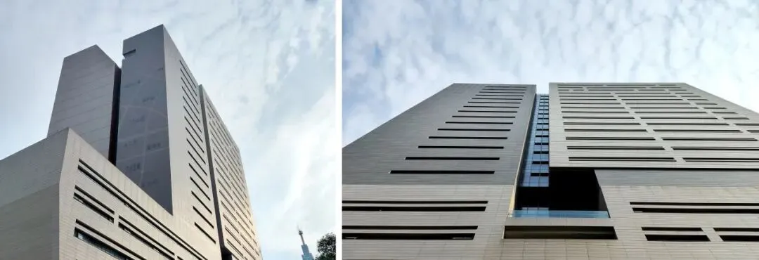 设计以“砌筑的城市”为灵感,将长沙城建史化作一部立体的“石头史书”。采用“迹忆”的设计语言,将城墙、街巷、桥梁、江水等城市记忆刻入建筑肌理,抽象的“井”字形布局在立面纵横切分出深浅不一的峡谷式内凹空间,如历史长河冲刷的印记,既将庞大体量化整为零,消解临街压迫感,又通过光影变化赋予建筑生命感知。深色陶板幕墙阴刻出老城肌理,冲刷出长沙城一直未曾改变的中心节点;塔楼库房在无采光要求的条件下,巧妙运用错位肌理的横向条窗暗喻刻入“史书”的文字,又仿佛遥远深邃的目光,注视着三千年的城市变迁。