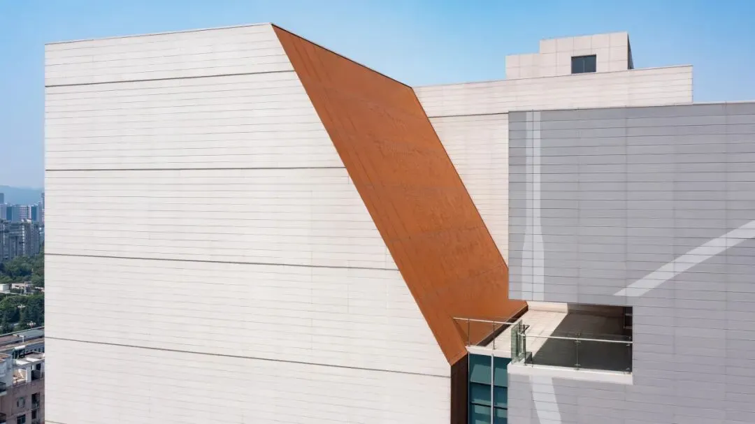 建筑顶部退台形成的空中文化沙龙、瞭望平台形如天心阁的城墙洞口,可以远眺湘江。侧墙上利用锈蚀钢板刻印的古城邑图若隐若现,展示从古到今的城市发展的脉络。