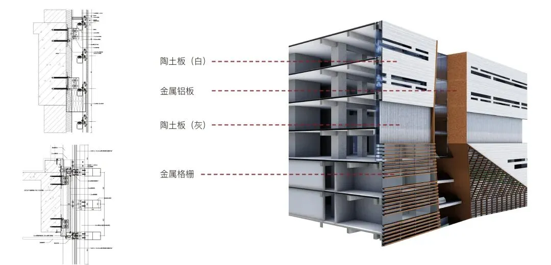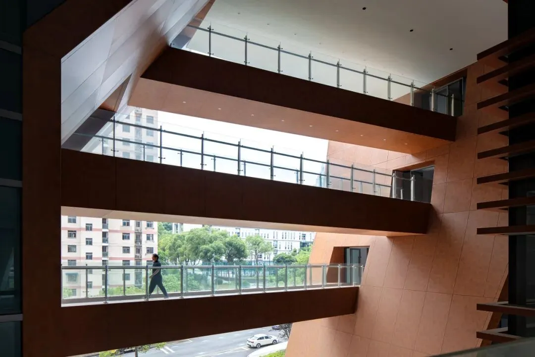 绿色层面,始终遵循因地制宜、被动优先、主动优化原则,让绿色融于设计细节。借势地形打造台地与架空层,南侧内凹主入口通高灰空间与空中花园形成立体“风道”,最大化实现自然通风与采光;屋顶铺设光伏板进行绿色发电;干挂陶板与水平内收的“檐下空间”打造高效水平遮阳,种植屋面、通风架空屋面与档案库区双层外墙,大幅提升建筑保温隔热性能。外立面陶板以天然陶土为原料,环保可回收且兼具保温、降噪、耐久性能。