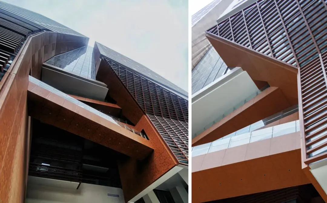 首层架空长廊多方位向城市开放,景观铺装抽象化长沙纵横交错的街道肌理,与建筑立面设计语言统一,从建筑延伸至场地的“街巷”,让市民穿行其间如穿梭在长沙三千年城建历史中;编年史地砖与景观铭牌散落其中,每一步皆是对城市记忆的触碰。三层台地巧妙化解5米地形高差,将场地与城市自然融合,东侧出入口结合台阶设置停留空间,为人行道留足缓冲,拾级而上与顶部空中观景平台遥相辉映,形成建筑 - 景观 - 室内三者融合的多维视角。