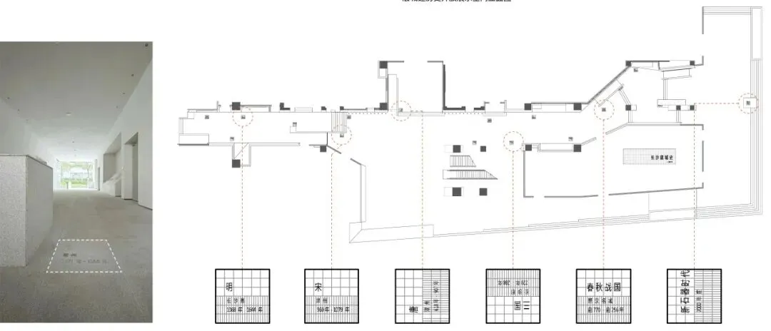 ▲首层开放展廊编年史地砖景观铭牌位置及实景 ©罗劲工作室