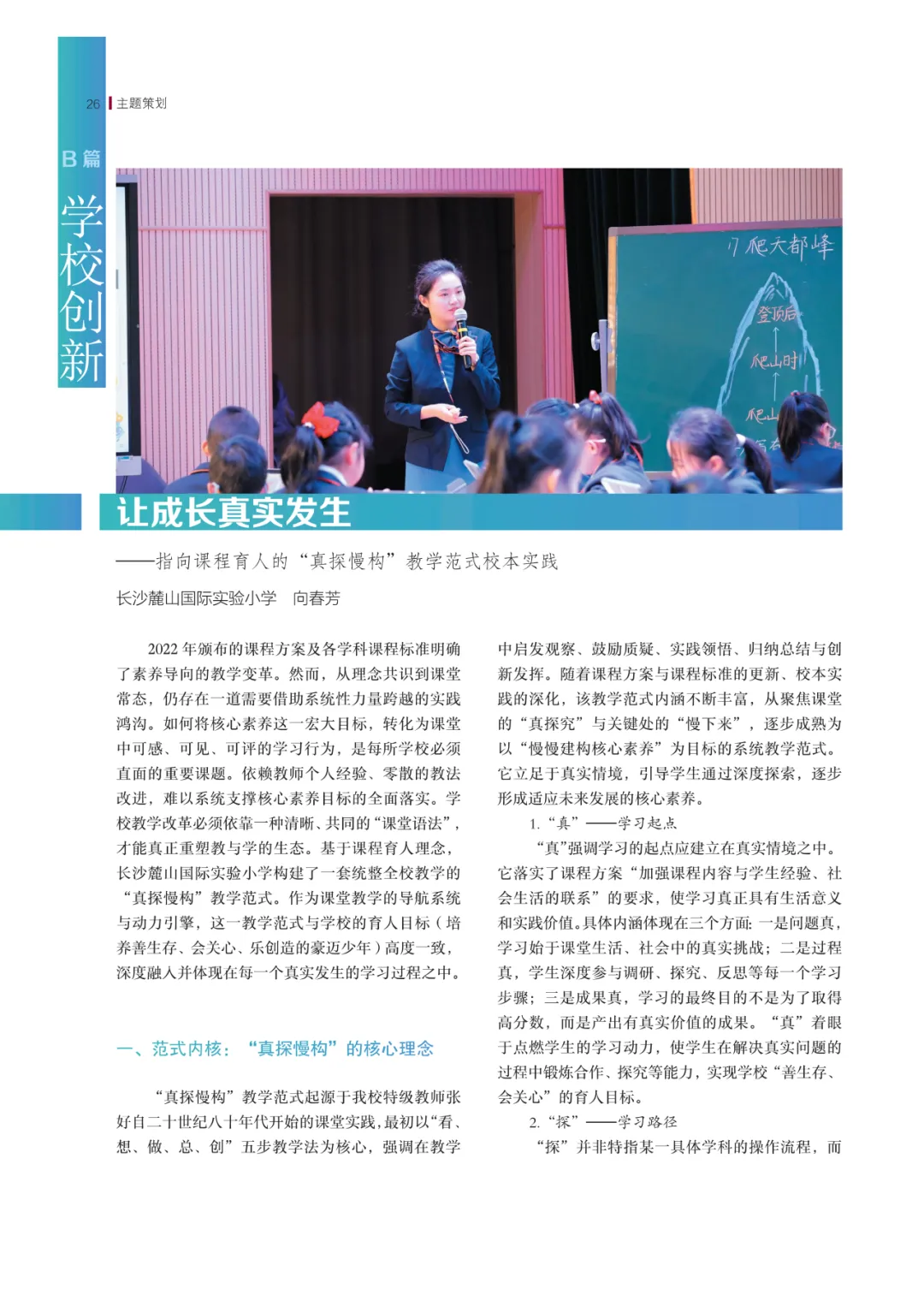 2022年颁布的课程方案及各学科课程标准明确了素养导向的教学变革。然而,从理念共识到课堂常态,仍存在一道需要借助系统性力量跨越的实践鸿沟。如何将核心素养这一宏大目标,转化为课堂中可感、可见、可评的学习行为,是每所学校必须直面的重要课题。依赖教师个人经验、零散的教法改进,难以系统支撑核心素养目标的全面落实。学校教学改革必须依靠一种清晰、共同的“课堂语法”,才能真正重塑教与学的生态。基于课程育人理念,长沙麓山国际实验小学构建了一套统整全校教学的 “真探慢构”教学范式。作为课堂教学的导航系统与动力引擎,这一教学范式与学校的育人目标(培养善生存、会关心、乐创造的豪迈少年)高度一致,深度融入并体现在每一个真实发生的学习过程之中。