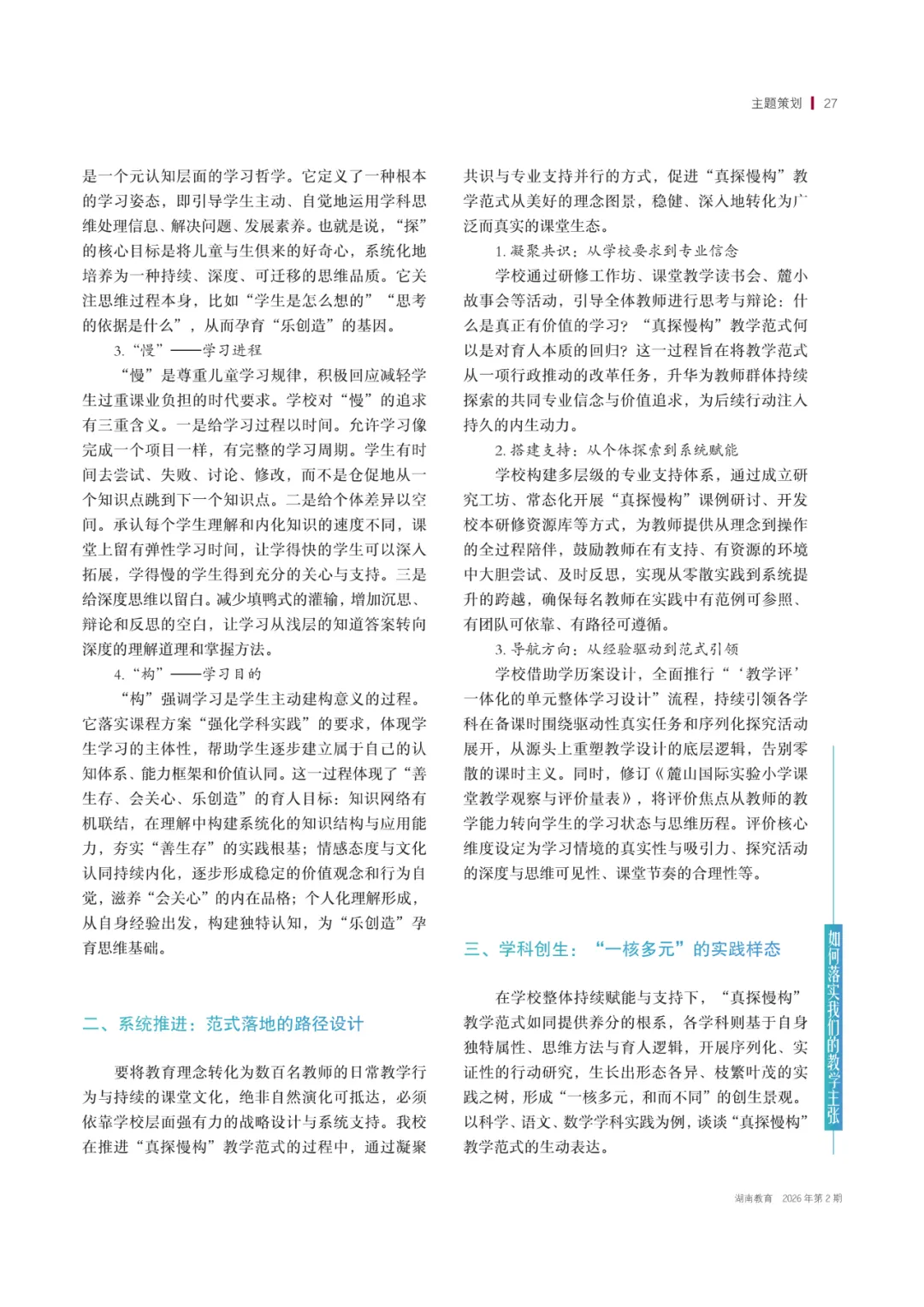近日,《湖南教育》发表了长沙麓山国际实验小学关于“真探慢构”教学范式的校本实践探索。该范式统整全校教学,成为课堂教学的导航系统与核心引擎,与学校“培养善生存、会关心、乐创造的豪迈少年”的育人目标高度契合,并深度融入每一个真实发生的学习过程。
