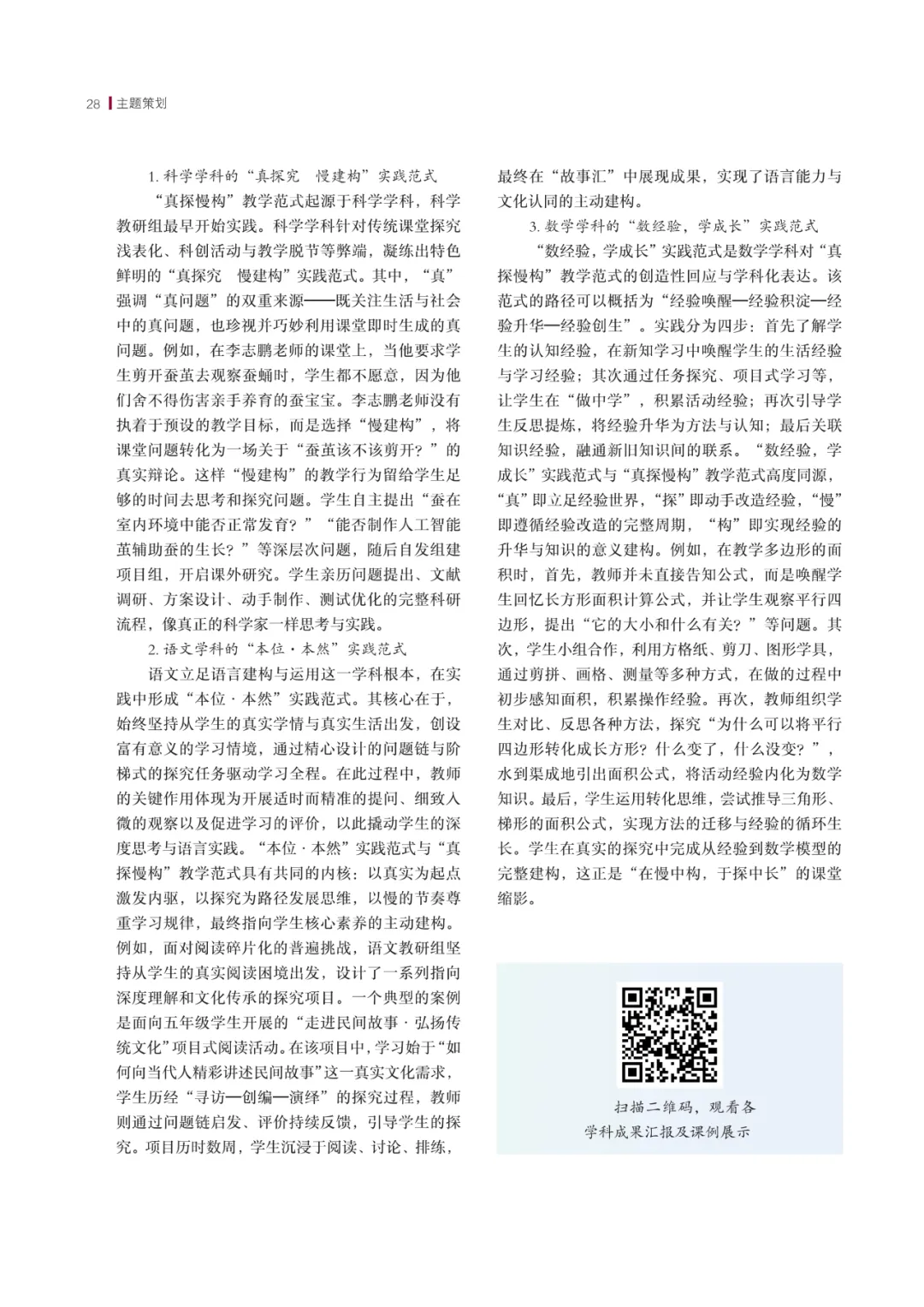 在学校整体持续赋能与支持下,“真探慢构”教学范式如同提供养分的根系,各学科则基于自身独特属性、思维方法与育人逻辑,开展序列化、实证性的行动研究,生长出形态各异、枝繁叶茂的实践之树,形成“一核多元,和而不同”的创生景观以科学、语文、数学学科实践为例,谈谈“真探慢构”教学范式的生动表达。