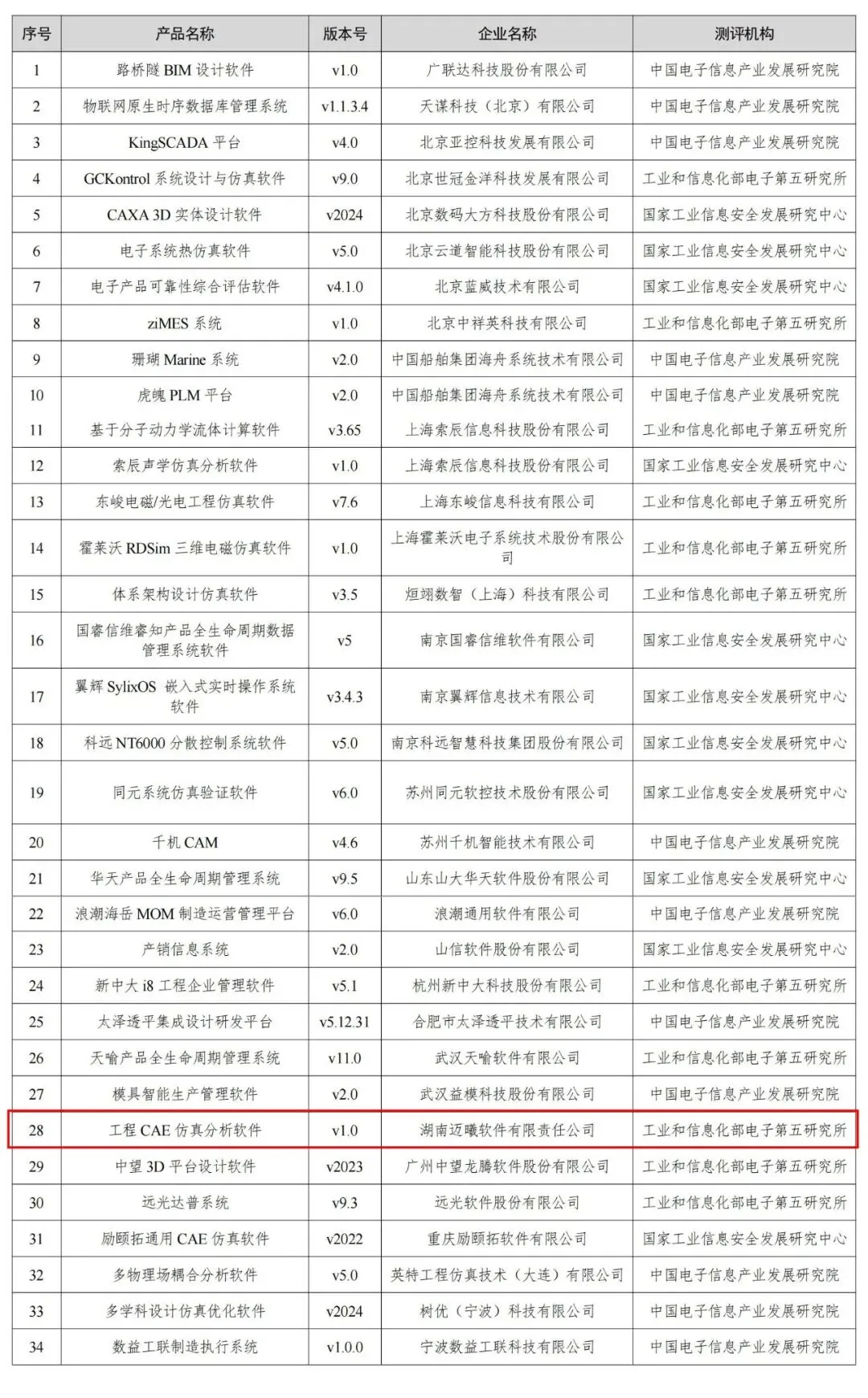 近日,工业和信息化部公示拟通过首版次软件评测产品名单,我市湖南迈曦软件有限责任公司的工程CAE仿真分析软件入选。具体的名单如下: