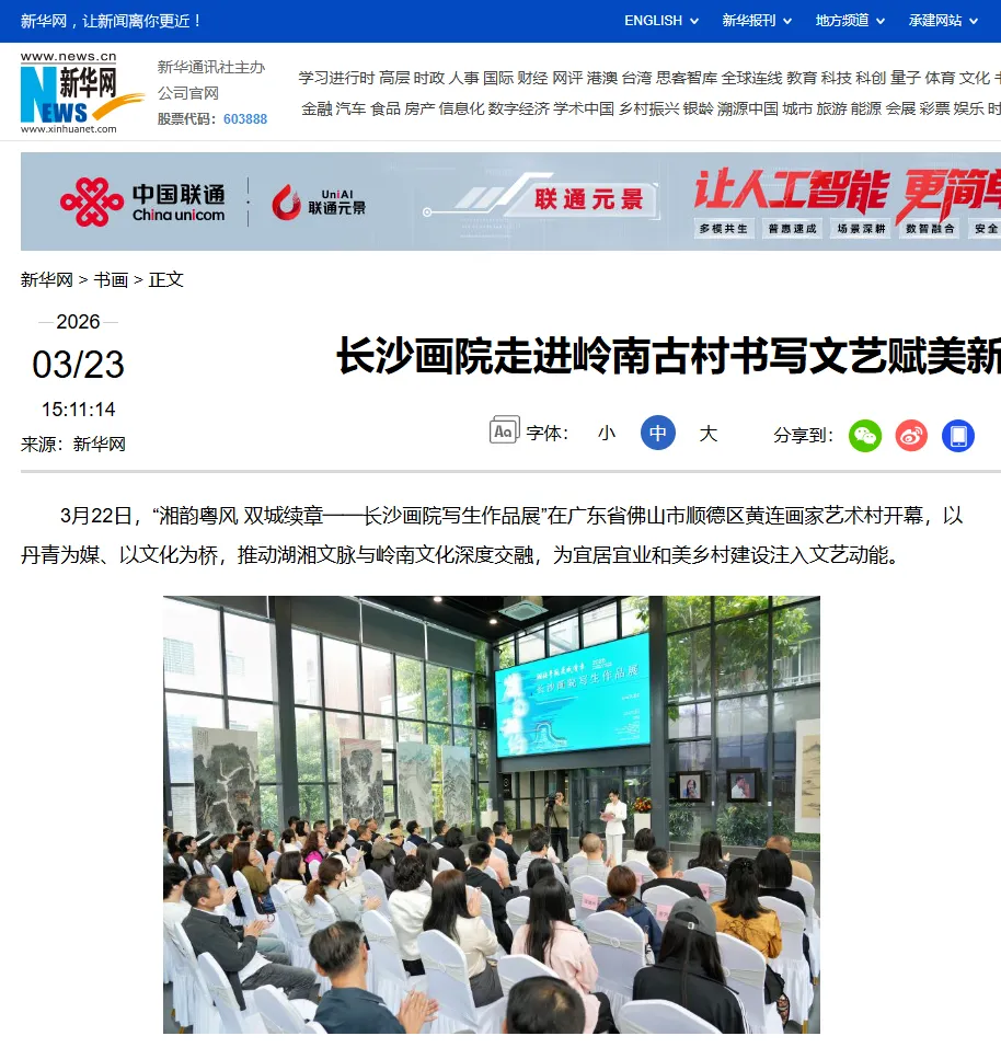 湖南省文联兼职副主席,长沙市文联党组书记、主席舒全球表示,佛山在推动文艺繁荣、乡村文化振兴方面取得了令人瞩目的成就,黄连画家艺术村更是将高端文化引入乡村基层的生动范例。希望以此次展览为起点,进一步加强湘粤两地文艺界的交流合作,让湖湘风骨与岭南风韵交相辉映,共同谱写新时代中国文艺发展的新篇章。