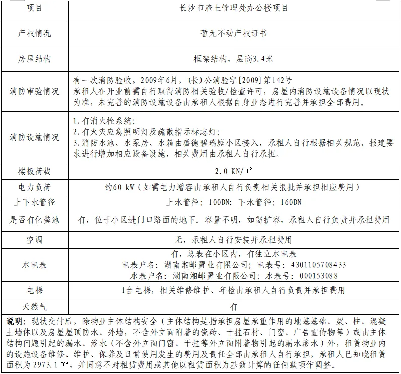 8.交付方式:现状交付,竞价人已认可项目的现状(包括但不限于该项目本身的国土控规及权证情况、工程物业条件、周边及本身自然物理状况,项目范围内的附属物、添附物、公用设施、配套设施、基础设施等状况,项目周边环境及相邻物业的情况,项目本身法律状况等),另本项目涉及的原有装修拆除、物业管理及停车由承租人自行负责并承担相应费用。现状交付标准见下表: