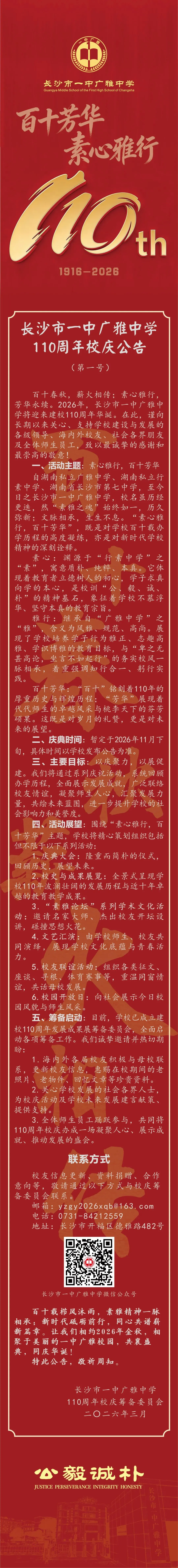 长沙市一中广雅中学110周年校庆公告(第一号)
