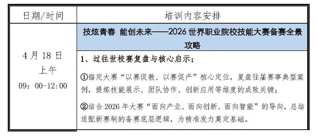 2026年世界职业院校技能大赛即将进入关键备赛期。日前教育部已发布2026年大赛实施方案(征求意见稿),明确争夺赛于5月底前完成,且大赛在赛道、组别、内容及评分权重等方面深化改革,更注重技能实战、职业素养与成果应用价值。为深入贯彻《全国职业院校技能大赛执行规划(2023—2027年)》等相关文件精神,助力各院校精准把握大赛风向、优化备赛策略、提升参赛水平,我单位拟举办“2026年世界职业院校技能大赛方案解读与备赛策略优化高级研修班”。现将有关事项通知如下: