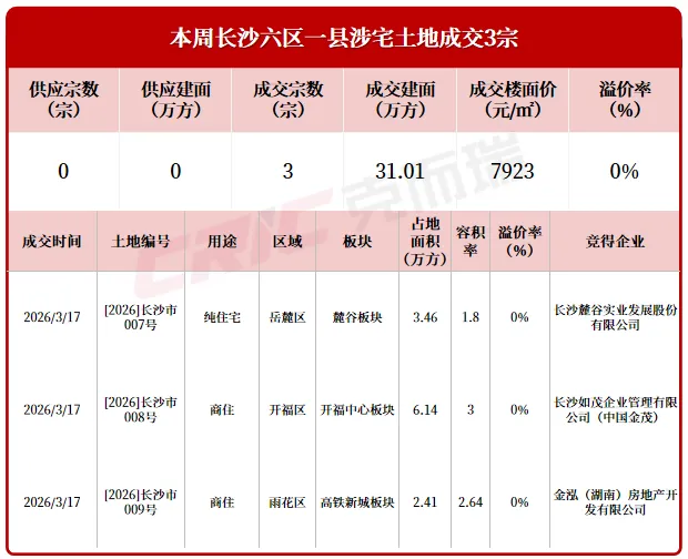 ▶ 3月17日长沙出让三宗涉宅用地,总收金24.57亿元,全部以底价成交。没有激烈竞价,没有溢价狂欢,市场理性回归。