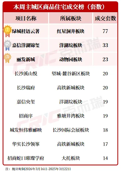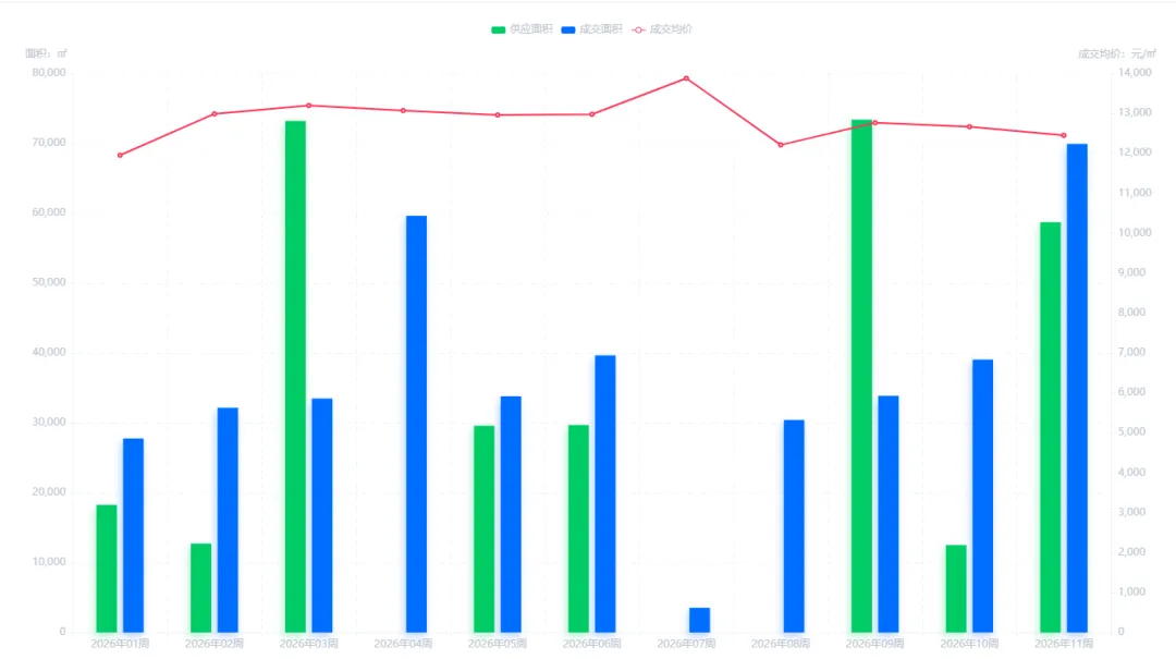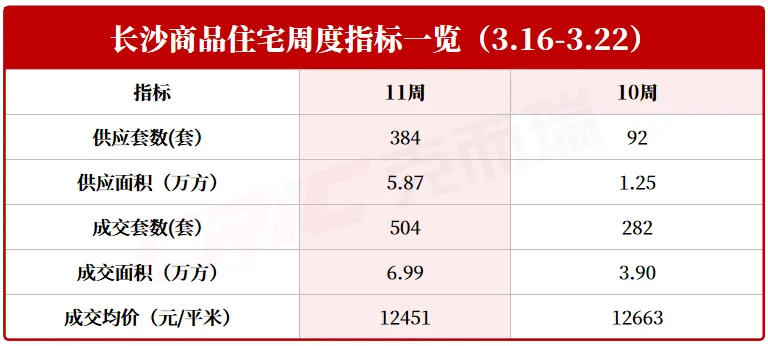 ▶第11周长沙新房市场成交量实现“五连涨”。供应端明显放量,新增供应384套(5.87万方),环比大幅增长;成交端表现强劲,成交504套(6.99万方),环比增长79%。整体来看,市场活跃度显著提升,“金三”行情持续深化。