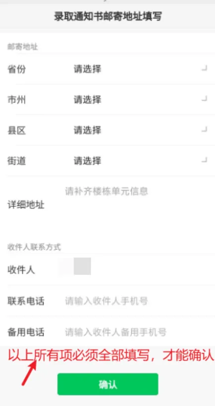 请认真填写收件地址,按要求选择和填写所有项(所有项必须填写,才能确认),确认后则完成确认入读操作。