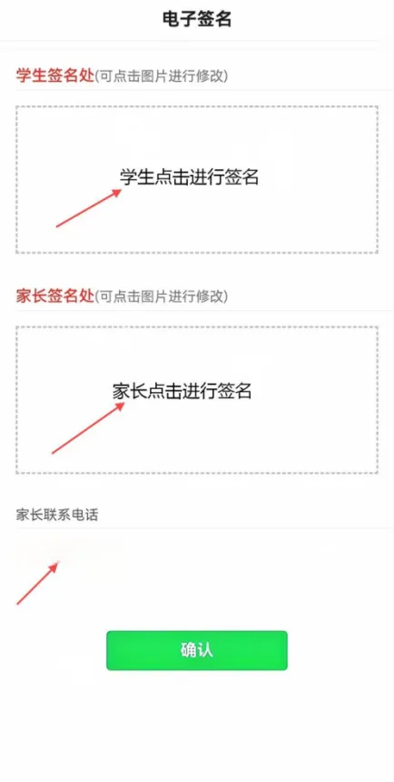 第二步:考生和家长按要求进行电子签名,正确填写家长正在使用的联系电话,点击确认按钮,阅读《放弃入读须知》进入下一步。