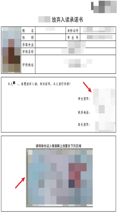 第三步:查看本人“放弃入读承诺书”(承诺书上相片、身份证、签名、家长电话等信息会自动生成),确认无误后点击确认完成提交,则完成放弃入读操作流程。