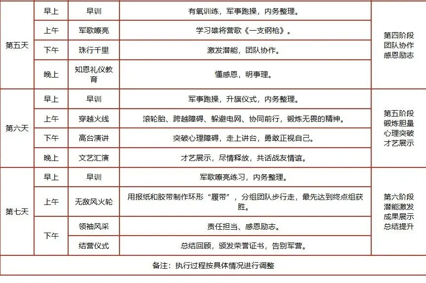 ★ 活动期间采用封闭式军事化管理制度,营员统一食宿,期间不安排家长探视。