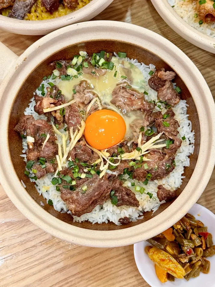 想吃清淡点可以试试窝蛋吊龙煲仔饭,鲜牛肉裹上蛋液滑嫩到不行。