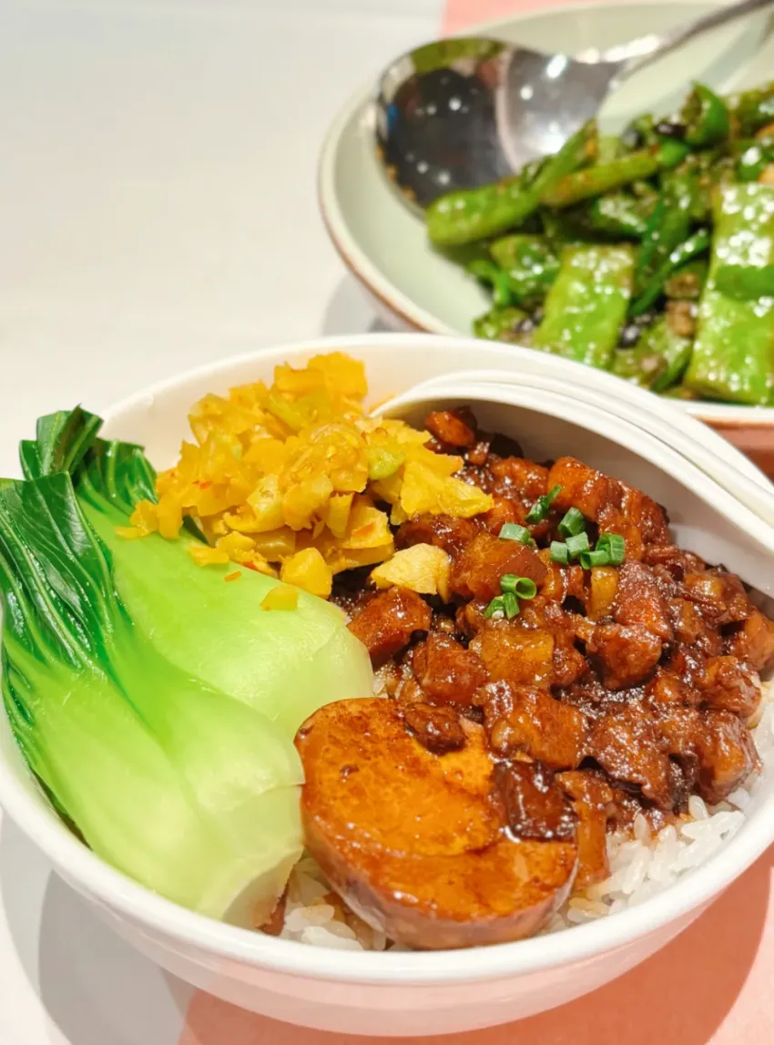 黑金流沙包松软微甜,咬开真的会流心,记得拿碗接住。他们家的湘味卤肉饭最好吃!每一粒米都裹满了卤汁,可以让服务员帮忙拌开,超级香!
