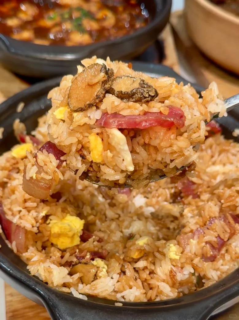 黑椒啫蘑菇也很惊艳,蘑菇一咬爆汁,黑椒味很浓郁!腊肠煲仔饭的腊肠像猪肉脯的口感,带点甜但完全不腻,米饭是粒粒分明的。整体口味偏清淡,带一家老小来吃正合适,就是饭点人巨多,记得早点去。