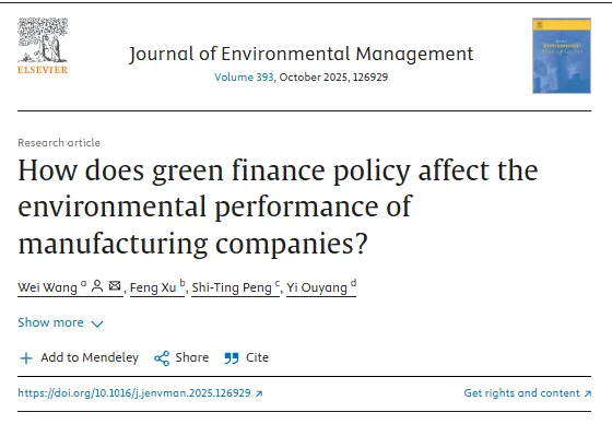 长沙理工大学经管学院本科生传来学术捷报!经管学院本科生与王伟副教授合作的论文“How does green finance policy affect the environmental performance of manufacturing companies? ”成功发表于Journal of Environmental Management(《环境管理杂志》),该期刊为环境科学与生态学领域享有国际声誉的JCR,环境科学领域Q1 期刊,以聚焦环境系统管理、政策与技术交叉领域的实证研究著称,尤其强调研究成果对环境管理实践的直接应用价值。此项成果不仅是长沙理工学子在国际学术舞台上的亮眼突破,更彰显了学校在科研育人与本科教育创新方面的坚实实力。