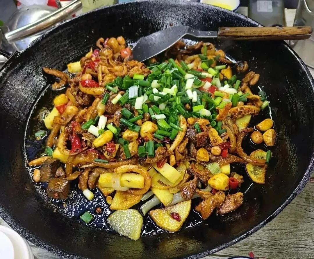 早上可以来一碗三鲜米粉,汤清但有骨香,辣椒自己加,热气上来,人就醒了。中午吃土家三下锅,肥肠、腊肉、豆腐在一口锅里咕嘟,咸香里带点辣,配米饭很稳。晚上找家本地馆子点擂辣椒皮蛋、酸萝卜炒肉,再来一碗葛根粉,软滑里有一点回甘。