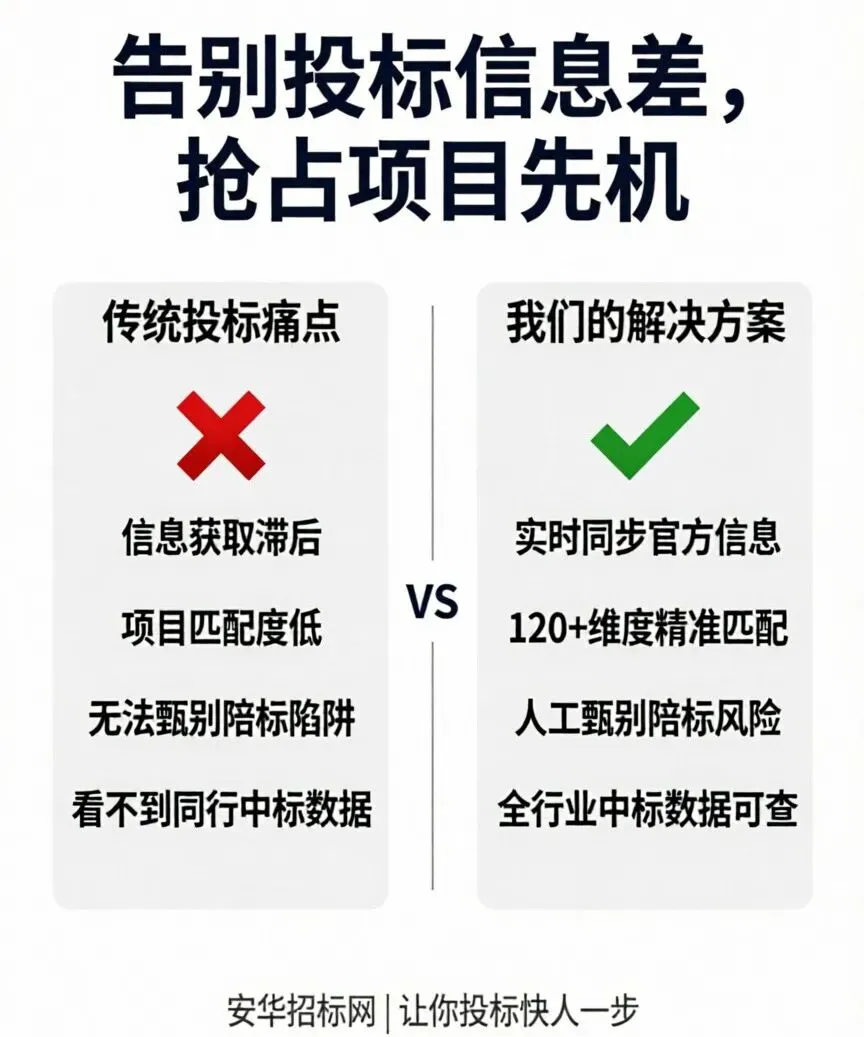 我们为本地投标企业准备了专属福利,现在即可免费领取:✅ 2026 招投标新政深度解读与投标适配指南电子版✅ 安华招标网(www.ahzb.net)本地 7 天免费会员权限✅ 本周最新精准高潜力新政适配招标商机清单✅ 本周内前 20 名预约,免费 1 对 1 新政合规投标诊断服务
