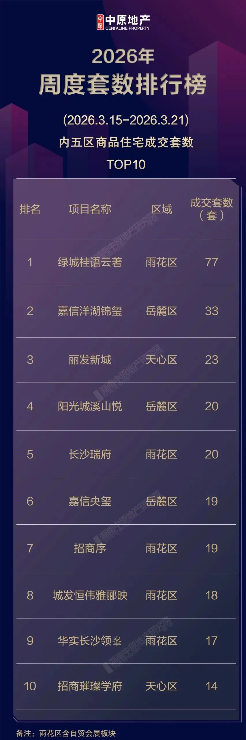 • 区域热度:雨花区(196套)> 岳麓区(183套)> 天心区(101套)