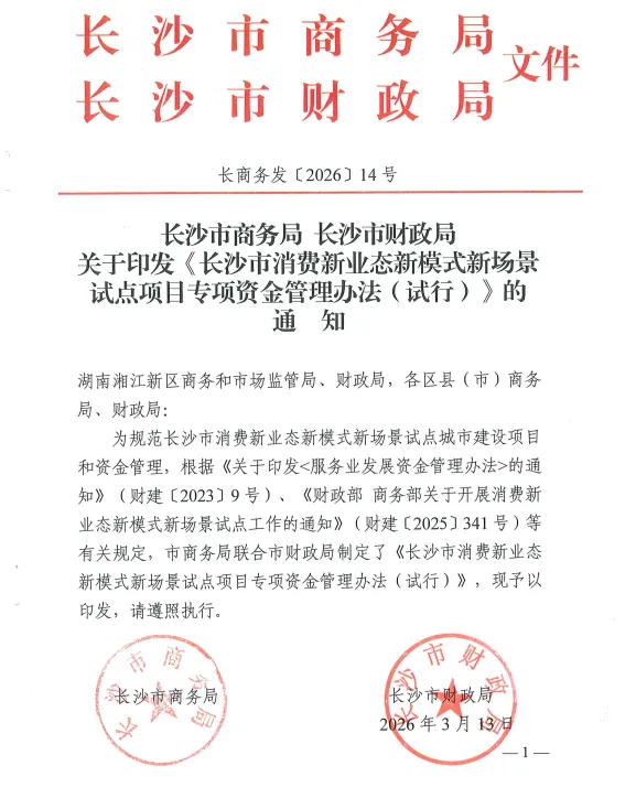 >【通知】长沙市商务局 长沙市财政局关于印发《长沙市消费新业态新模式新场景试点项目专项资金管理办法(试行)》的通知