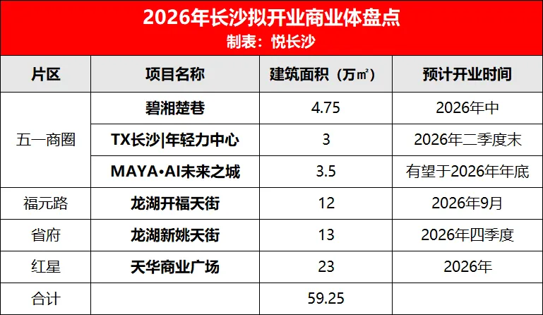 据不完全统计,今年长沙预计有6大商业体将要开业,总体量约59万㎡,除了龙湖新姚天街、开福天街之外,还有碧湘楚巷、TX长沙|年轻力中心等。