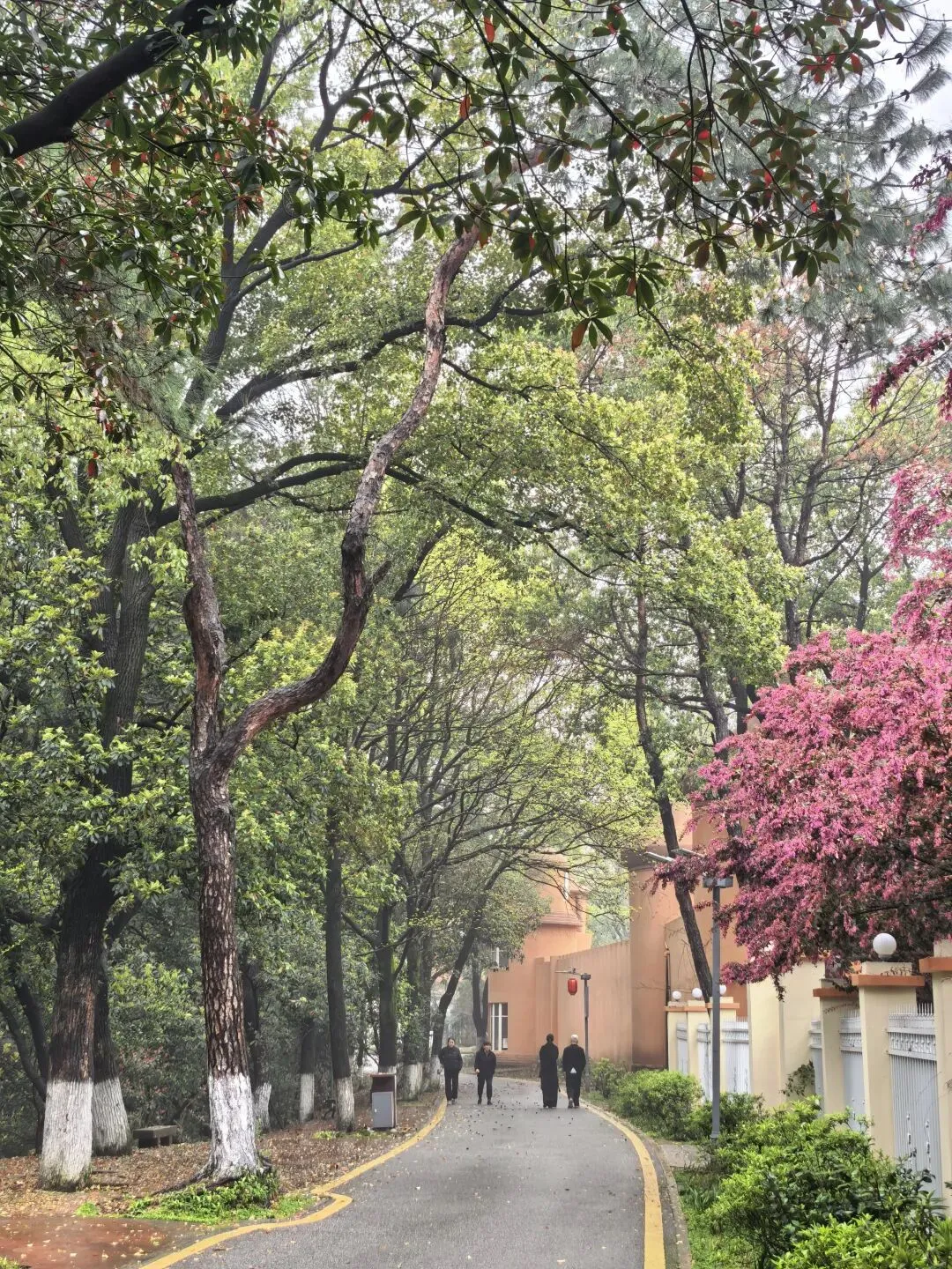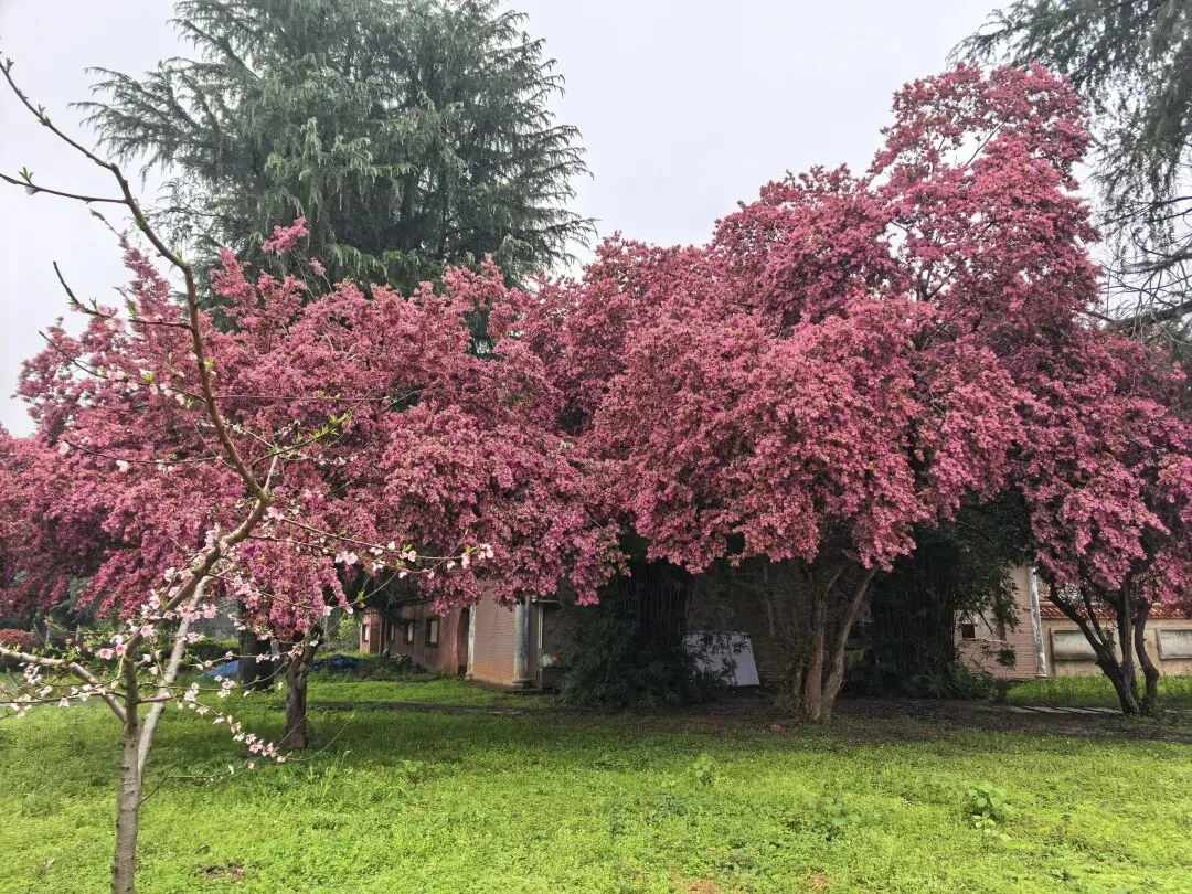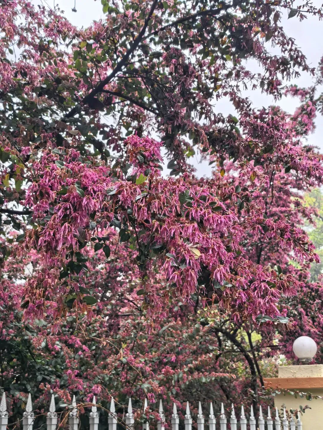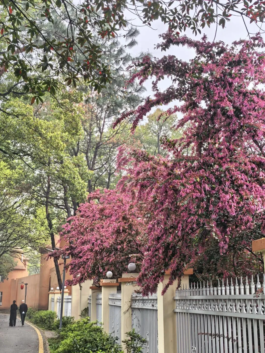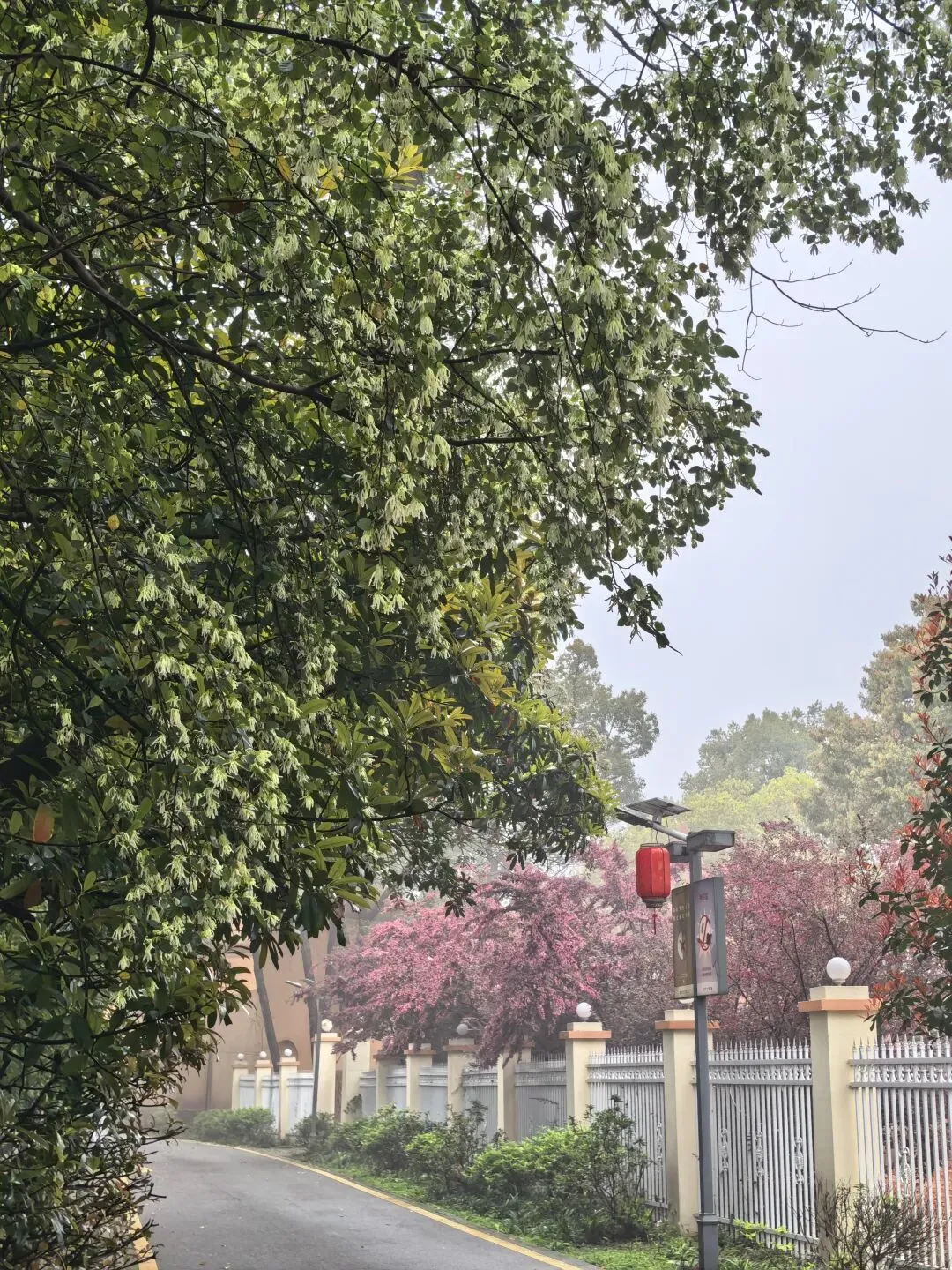红檵木探出院墙,红得娇艳。白檵木白中透绿。 挂满翠绿新叶的枫香树,令人想起去年岁末满树红叶的枫香树,不禁感叹一岁一枯荣、秋去春来时光的流逝。