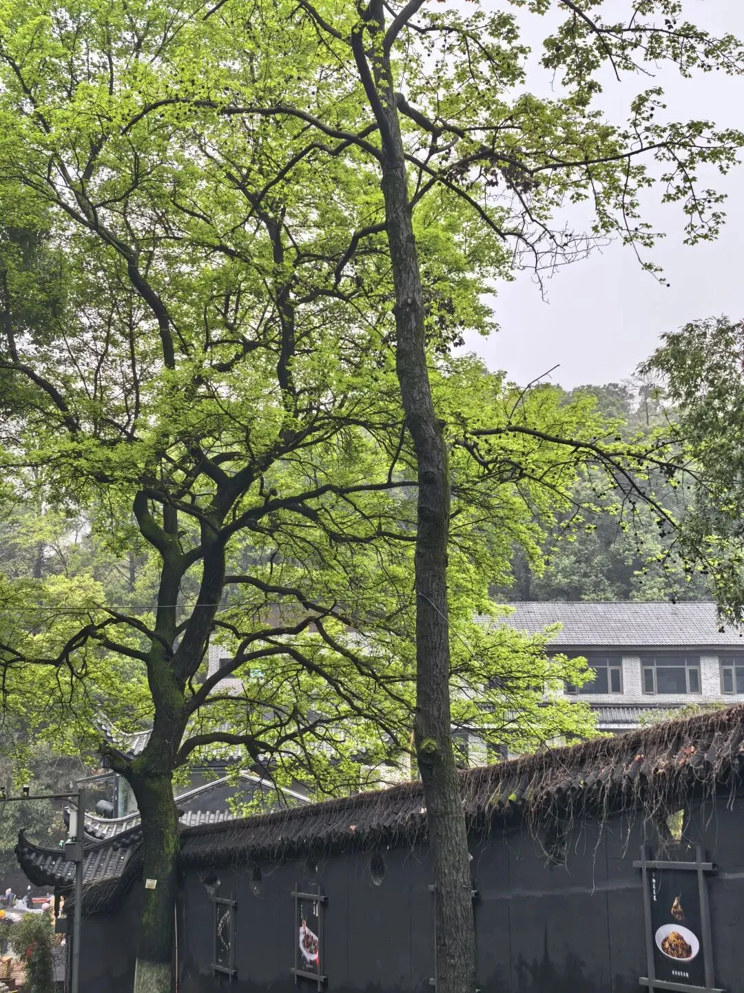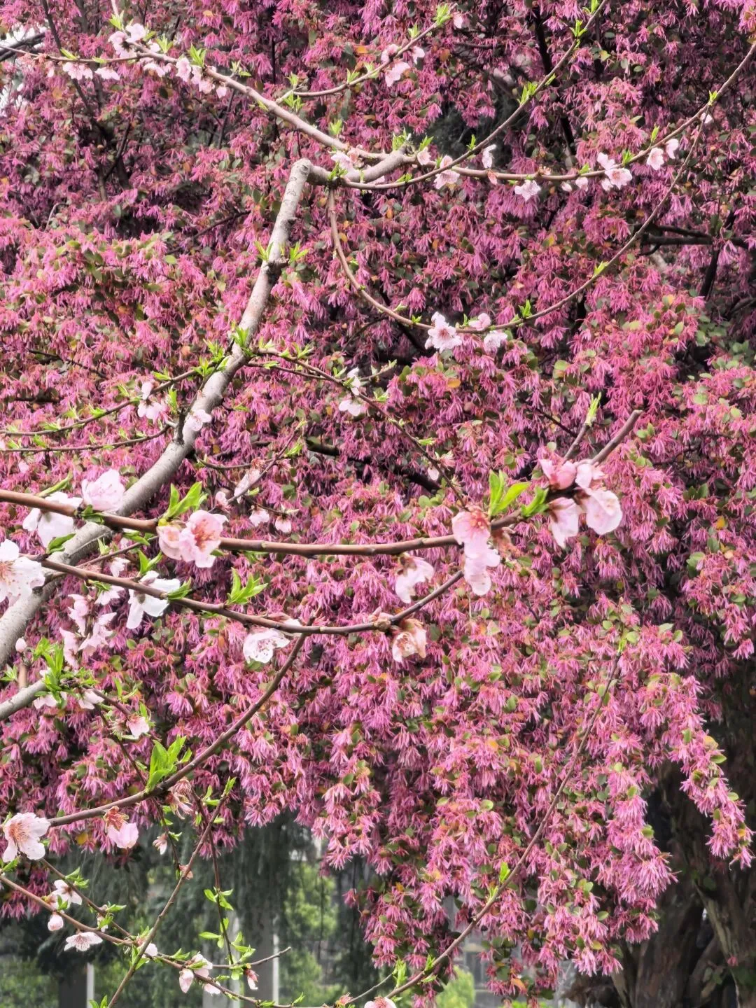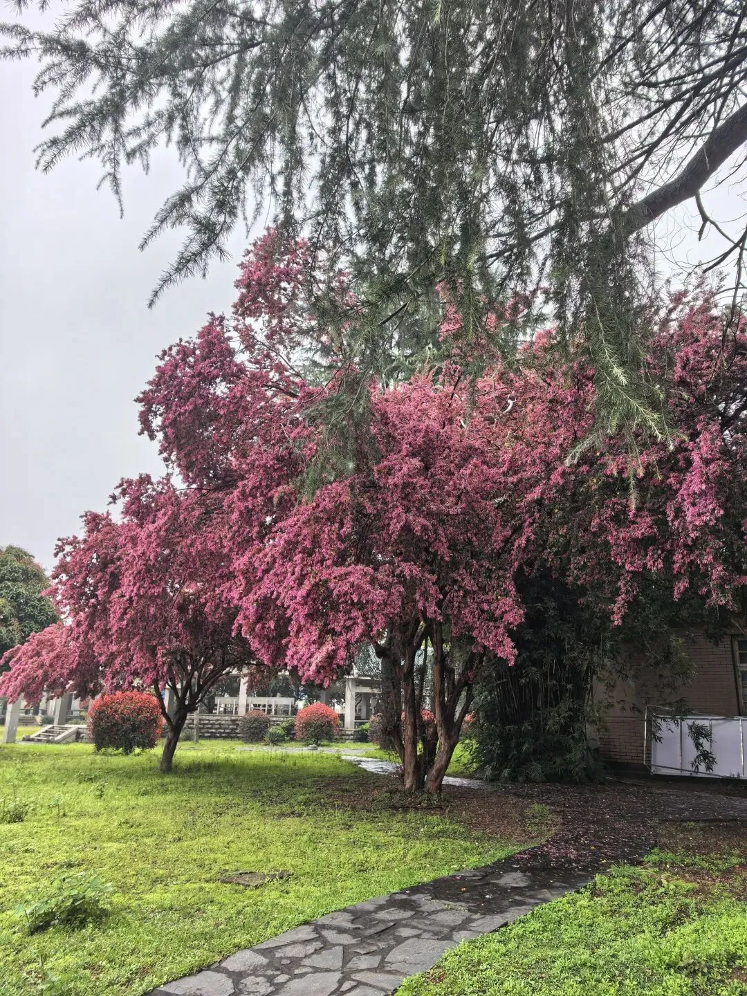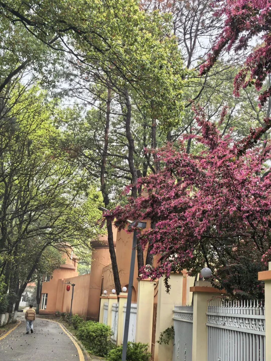 红檵木探出院墙,红得娇艳。白檵木白中透绿。 挂满翠绿新叶的枫香树,令人想起去年岁末满树红叶的枫香树,不禁感叹一岁一枯荣、秋去春来时光的流逝。