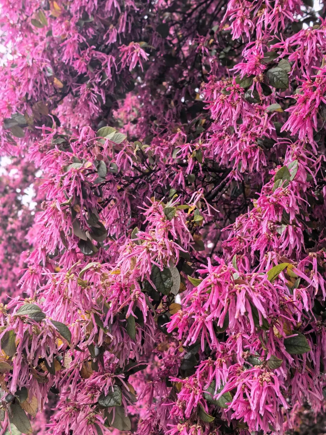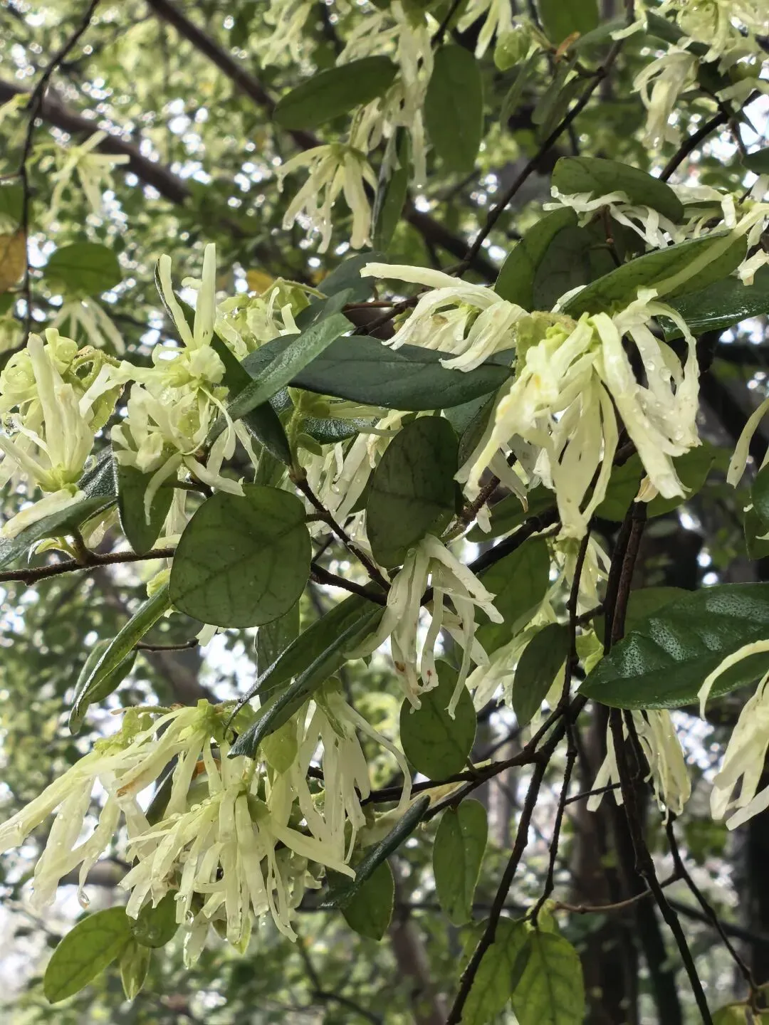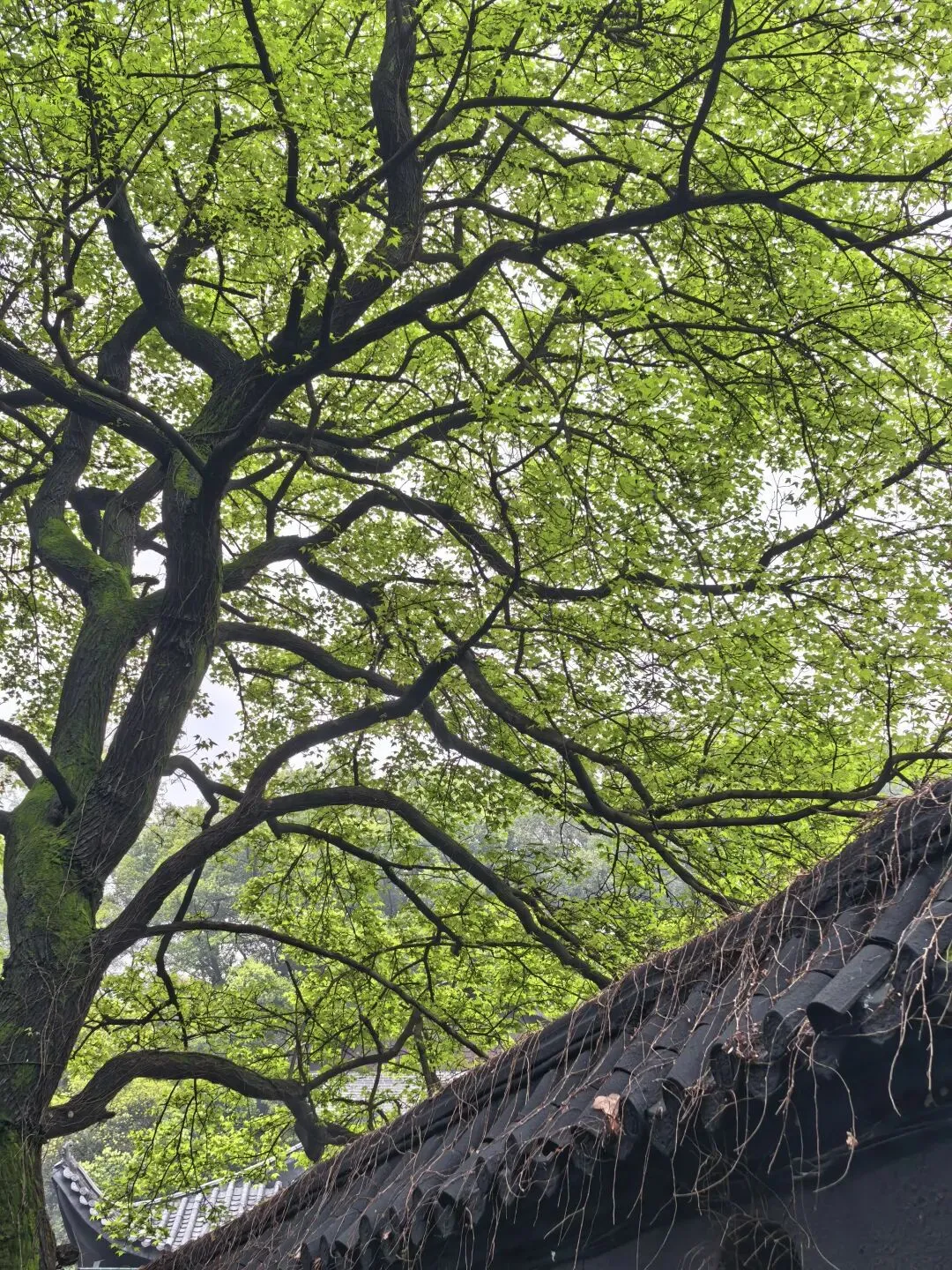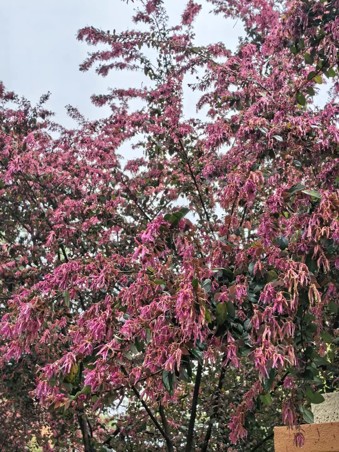 红檵木探出院墙,红得娇艳。白檵木白中透绿。 挂满翠绿新叶的枫香树,令人想起去年岁末满树红叶的枫香树,不禁感叹一岁一枯荣、秋去春来时光的流逝。
