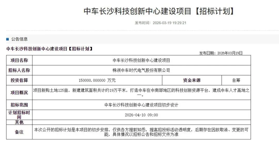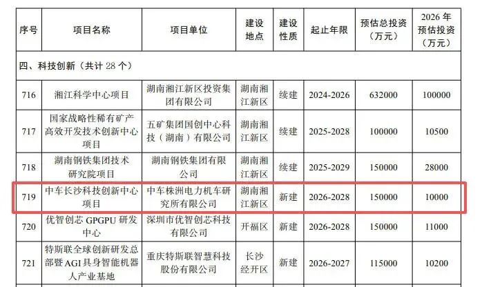 今年2月,官方公布《长沙市2026年重点建设项目清单》,中车长沙科技创新中心位列其中,是今年的新建项目,总投资15亿,今年投资1亿。