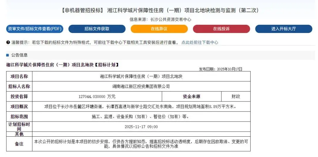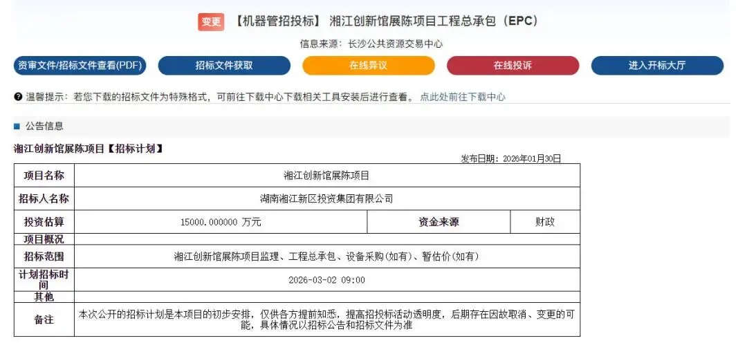 与此同时,湘江创新馆展陈项目工程总承包(EPC)也进入招标阶段。