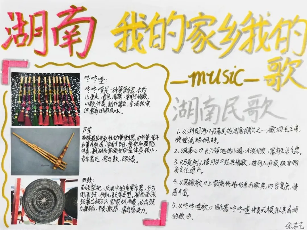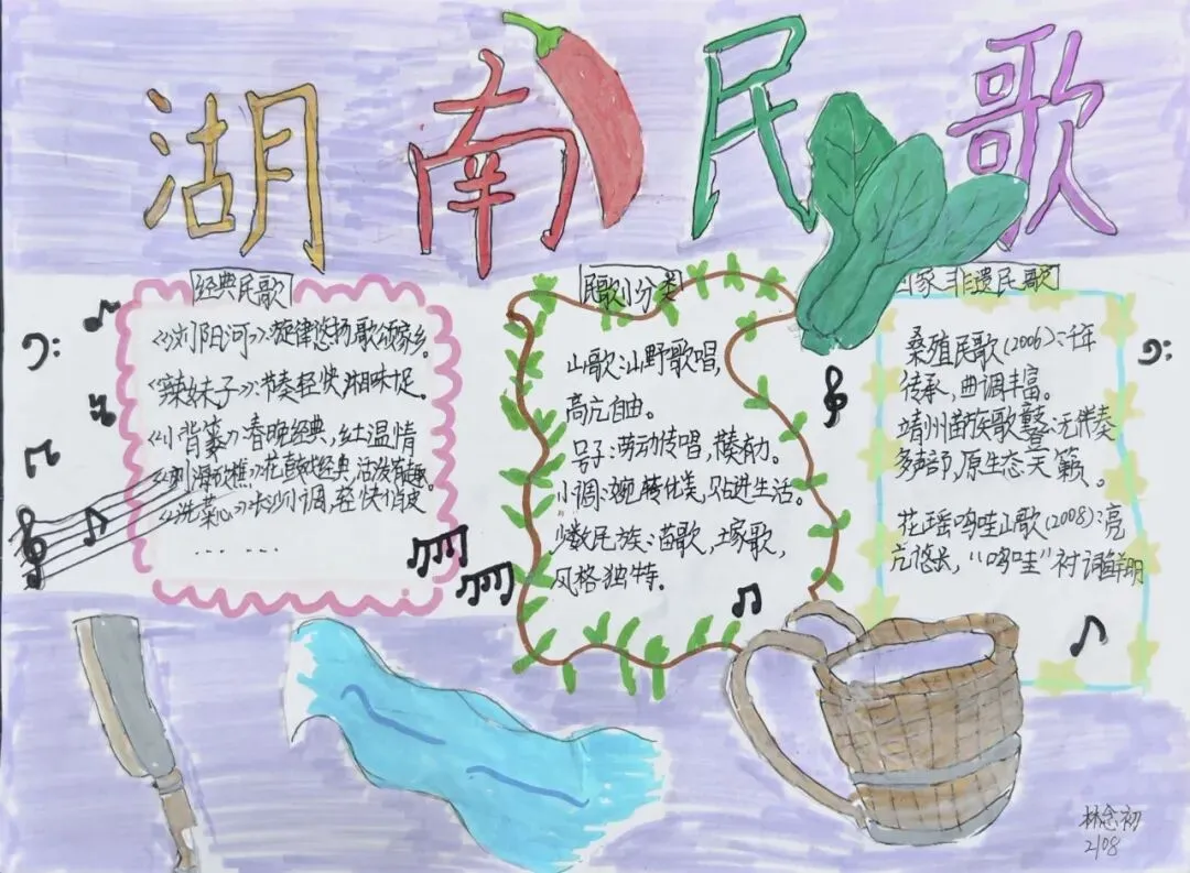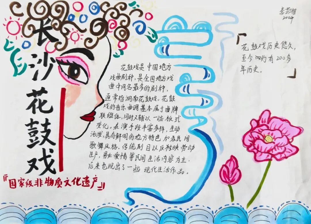一曲民歌传古韵,千年文脉润童心。队员们聚焦全国各族民歌,收集南、北方不同民族的民歌素材,用彩笔勾勒湖南民歌、花鼓戏等民族文化的绚丽画卷,浓缩家乡的本土文化特色,展现中华文脉的深厚底蕴。
