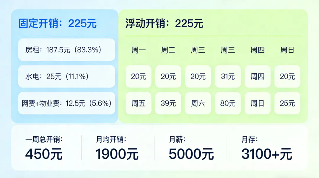 • 一周总开销:450元(固定225元+浮动225元),月均1900元,精准控在2000内。