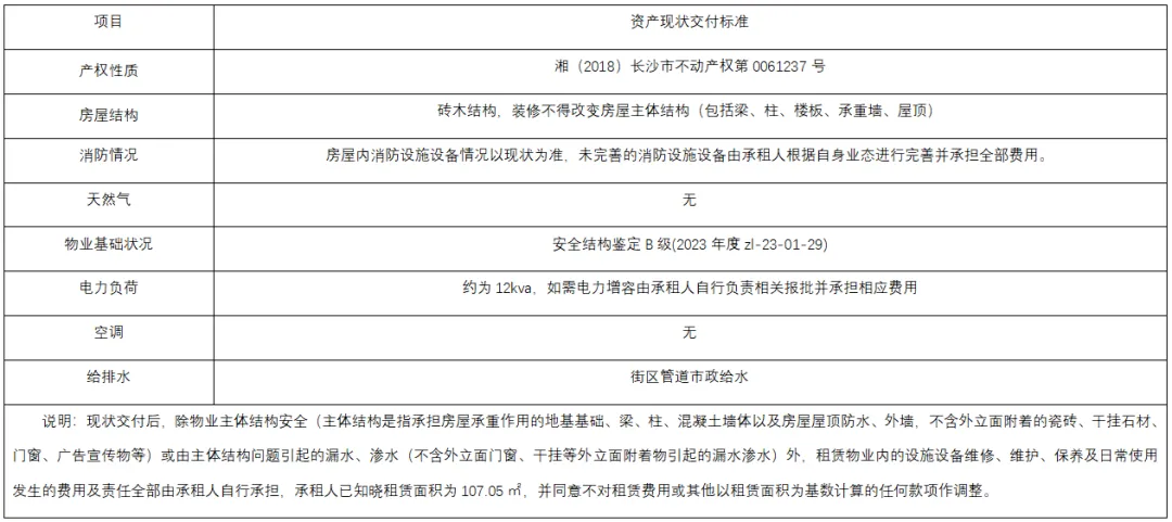 8.交付方式:现状交付,意向人已认可商铺的现状(包括但不限于该商铺本身的国土控规及权证情况、工程物业条件、周边及本身自然物理状况,商铺范围内的附属物、添附物、公用设施、配套设施、基础设施等状况,商铺周边环境及相邻物业的情况,商铺本身法律状况等),须自行核实商铺合规性,招商人不承担权证及物业瑕疵责任,现状交付标准如下: