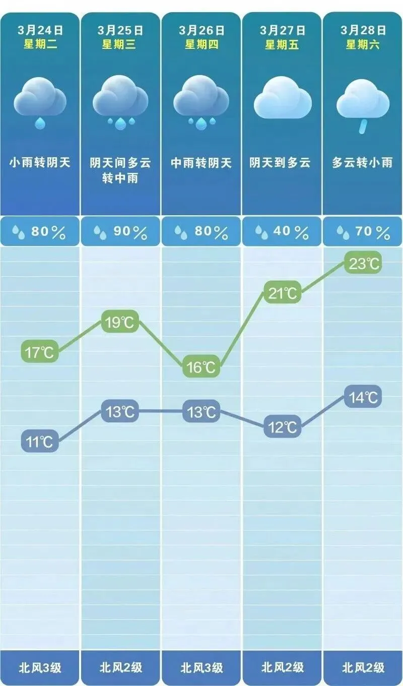 中间几天的雨“绵绵无绝期”的节奏:24日小雨转阴天,北风3级,11℃至17℃;25日阴天间多云转中雨,气温13℃至19℃,千万记得带伞;26日中雨转阴天,气温13℃至16℃,全天阴冷,鞋子最好穿防水的;27日是本周唯一好天气,阴天到多云,气温回升到12℃至21℃,洗晒、出门、遛弯可安排,错过又要等;28日多云转小雨,气温14℃至23℃,但要小心被雨水“偷袭”;29日长沙大雨,气温14℃至18℃,宅家最稳妥。