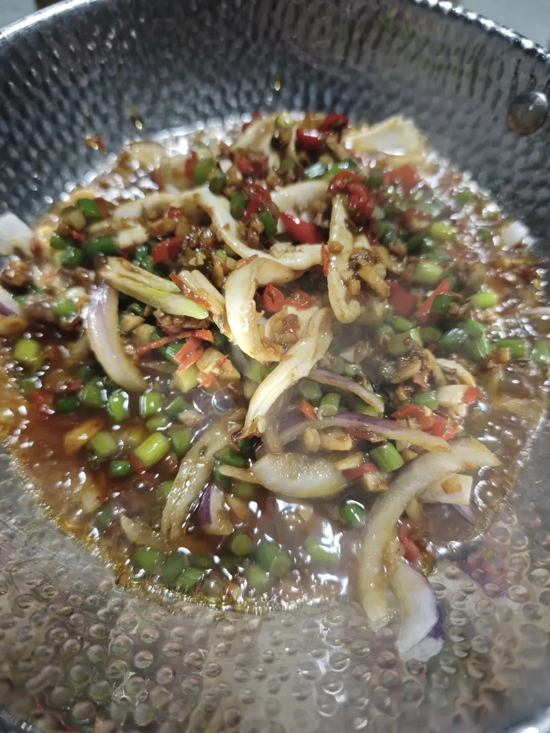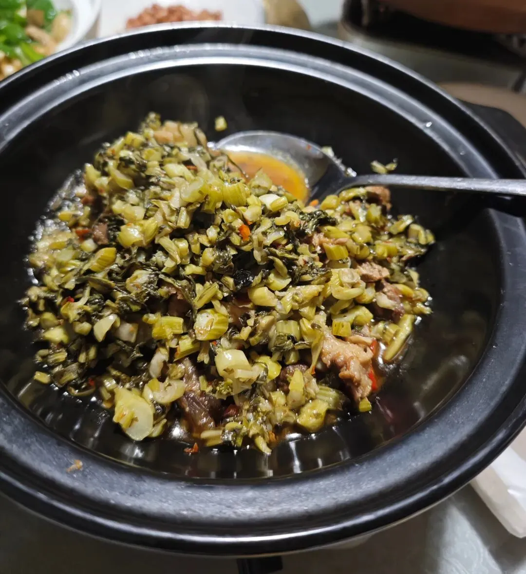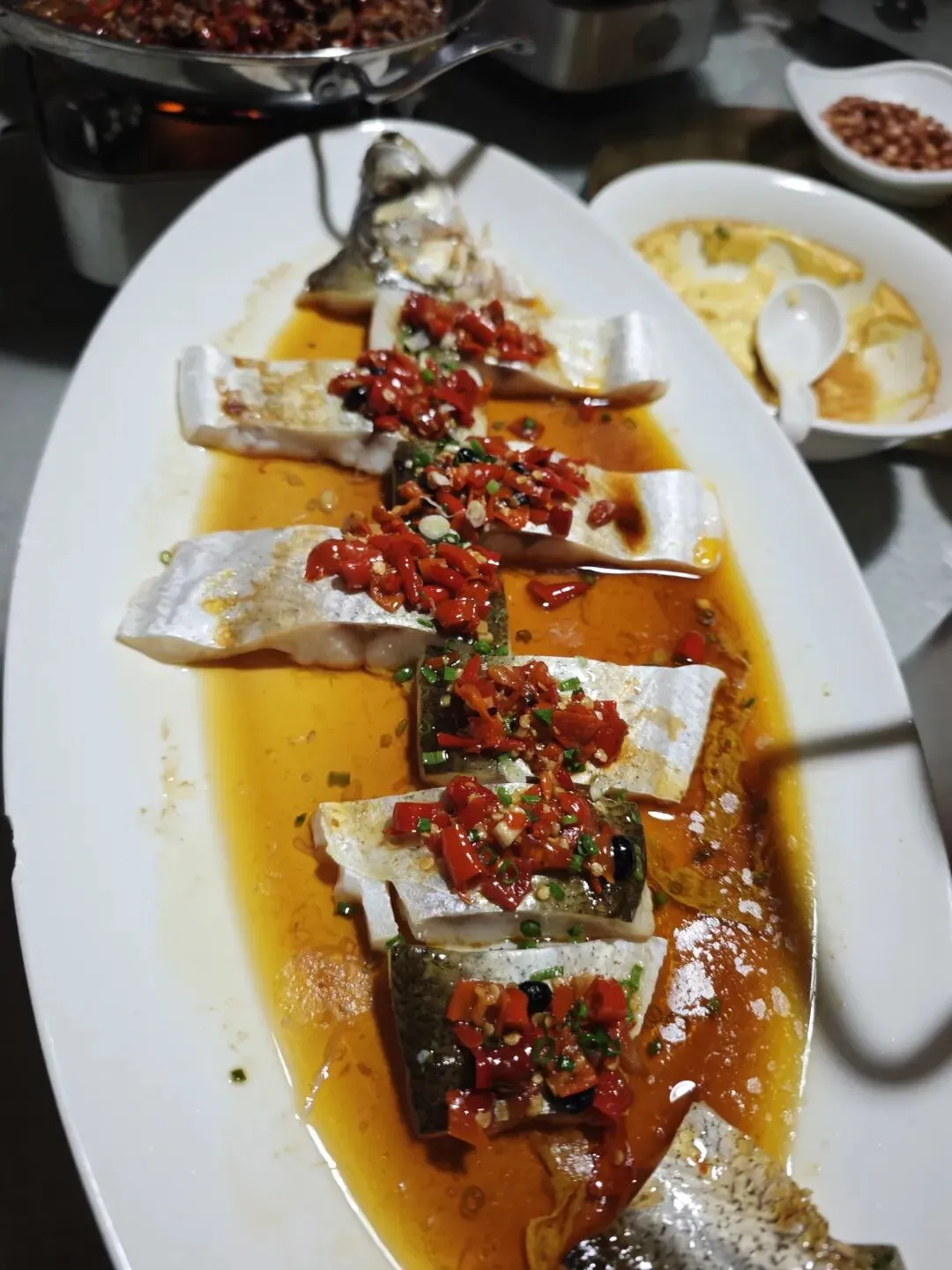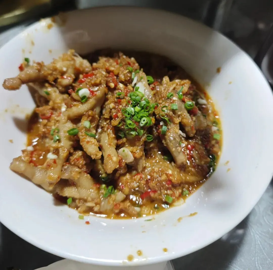 这道菜基本没动,青椒清甜微辣,香辣适中,鲍鱼肉质鲜嫩,嚼起来富有弹性,整道菜香气浓郁,火候到位。朋友说,他家这个香辣鱼开胃菜也还不错,之前一盘已经吃完了,我来了就再叫了一盘。小鱼仔有嚼劲,辣味浓郁且层次丰富,经过重口味调味,鱼鲜味不太突出。鸡汤是这道菜的灵魂,鸡肉和鸡骨经过炖煮,其中的鲜味物质得到释放,使汤汁变得浓郁,滋味醇厚。鸡肉纤维较柔软,吃起来不柴不老,鸡皮弹韧性不错,不过我一般不喜欢吃鸡皮。鱿鱼已经上了一会儿了,还有一些鱿鱼片,这道菜除了使用酱料,还用了大量的蒜苔节、洋葱、辣椒调味,鱿鱼新鲜,无腥味,这个时候最入味。牛肉下面铺垫了新鲜的韭菜段,上面一大把干辣椒、新鲜辣椒、蒜米的混合料,韭菜煮出香味后,和牛肉一起入口,算是很好的一个搭配。刁子鱼在蒸制前分切成块,便于客人食用。表面用了剁椒、豆豉、干辣椒调味,鱼肉鲜美油润,估计蒸鱼时加了动物油,这是蒸菜的秘密武器。盛两勺拌饭,一口就被这老长沙人的最爱美食俘获,不用多说。笋子斜着切成片,用了少量干菜同炒,一老一嫩、一干一鲜,吃起来来也是别有一番滋味。鸡爪用料扎实,调味厚重,辣度适中,我一口气啃了两个。