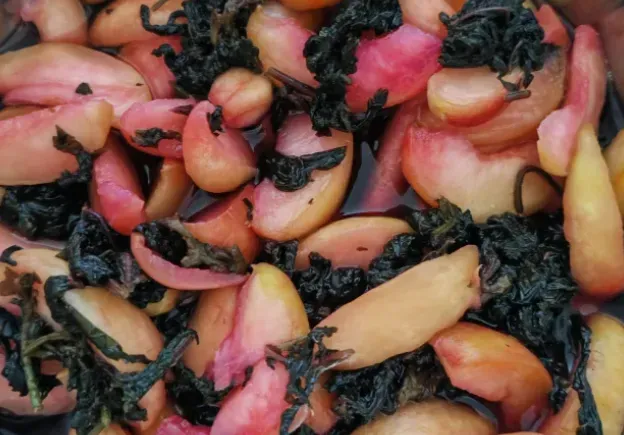 紫苏桃子将紫苏的清香与桃子的清甜完美结合。新鲜的桃子去核切块,与紫苏、冰糖等一起腌制,桃子吸收了紫苏的独特香气,口感酸甜可口,清爽解腻。一口咬下去,既有桃子的鲜嫩多汁,又有紫苏的独特风味,是长沙街头别具一格的特色小吃。