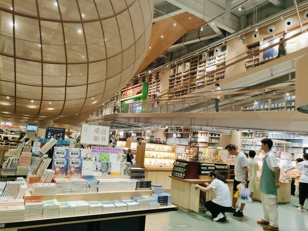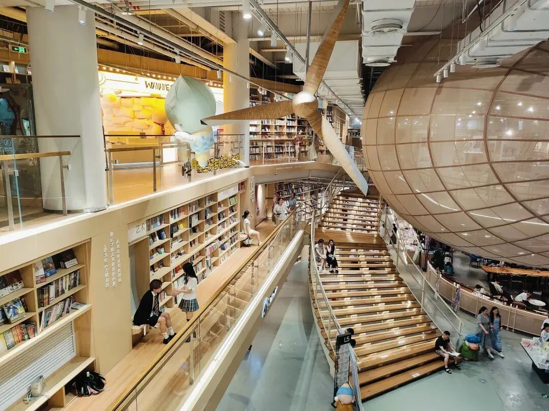 巨型飞艇装置、超 高书墙,颜值直接拉满,既是书店也是绝 佳拍照地。挑一本喜欢的书,找个靠窗的位置坐下,听着窗外的雨声,伴着书香放空自己。点一杯咖啡,不用赶时间,不用想琐事,就这样慵懒地待一下午,简直是打工人的治 愈时刻。